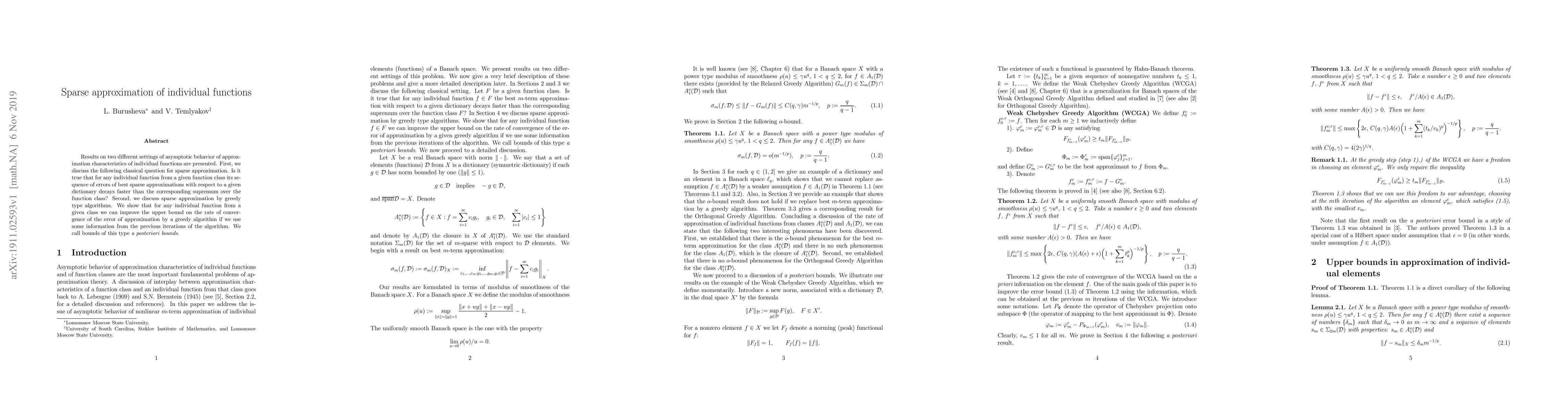 Results on two different settings of asymptotic behavior of approximation characteristics of individual functions are presented. First, we discuss the following classical question for sparse approximation. Is it true that for any individual function from a given function class its sequence of errors of best sparse approximations with respect to a given dictionary decays faster than the corresponding supremum over the function class? Second, we discuss sparse approximation by greedy type algorithms. We show that for any individual function from a given class we can improve the upper bound on the rate of convergence of the error of approximation by a greedy algorithm if we use some information from the previous iterations of the algorithm. We call bounds of this type a posteriori bounds.