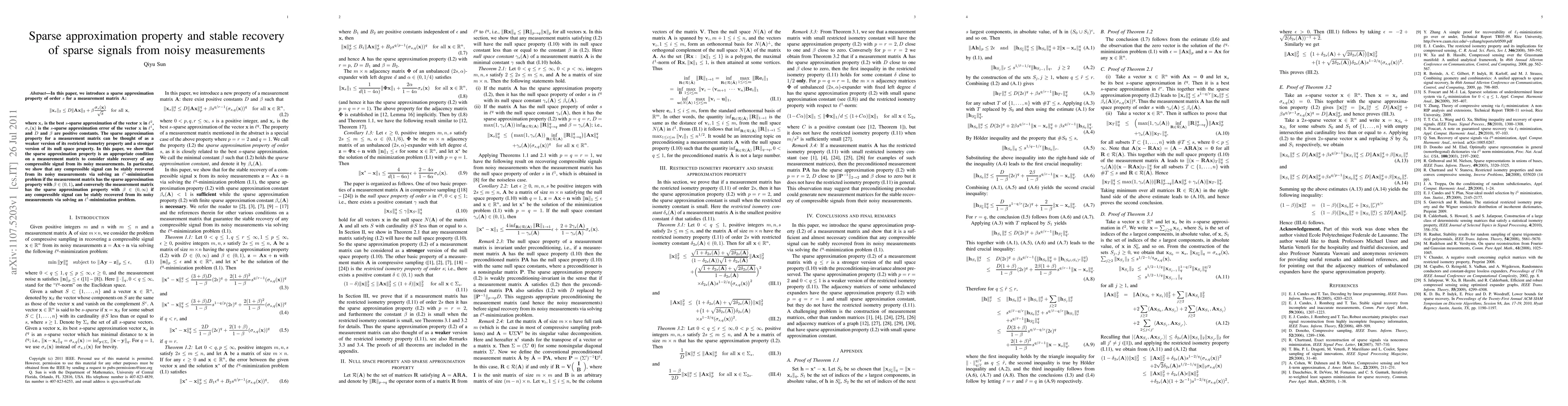 This paper introduces a sparse approximation property for measurement matrices that allows for stable recovery of compressible signals from noisy measurements, providing an alternative to the restricted isometry property.