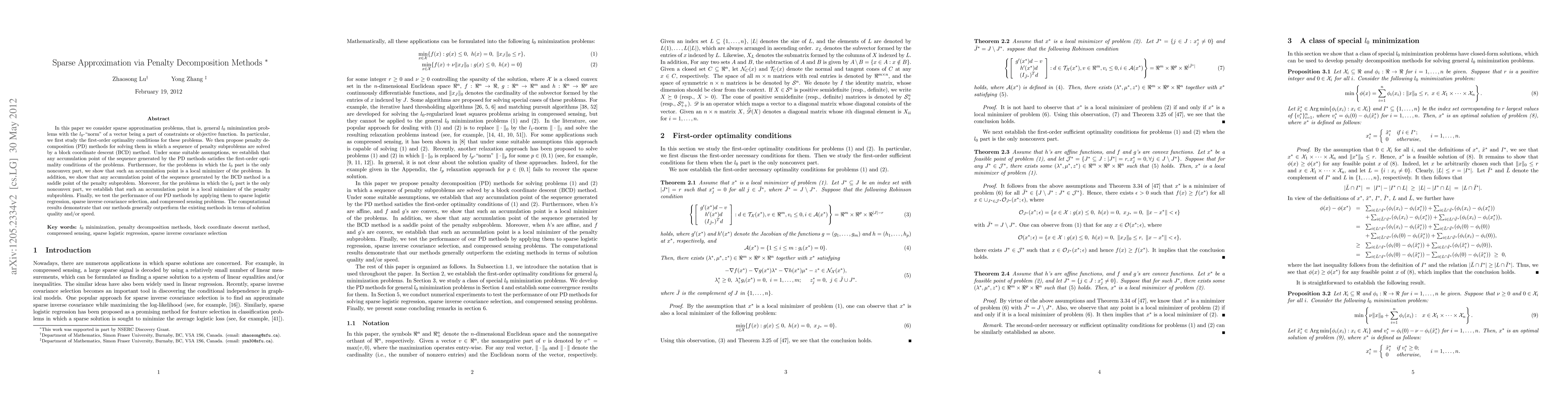 This paper proposes penalty decomposition methods for solving sparse approximation problems, specifically $l_0$ minimization issues. It demonstrates that these methods, implemented via block coordinate descent, yield local minimizers under suitable conditions, and tests their performance against existing methods in sparse logistic regression, inverse covariance selection, and compressed sensing, showing improved solution quality and speed.