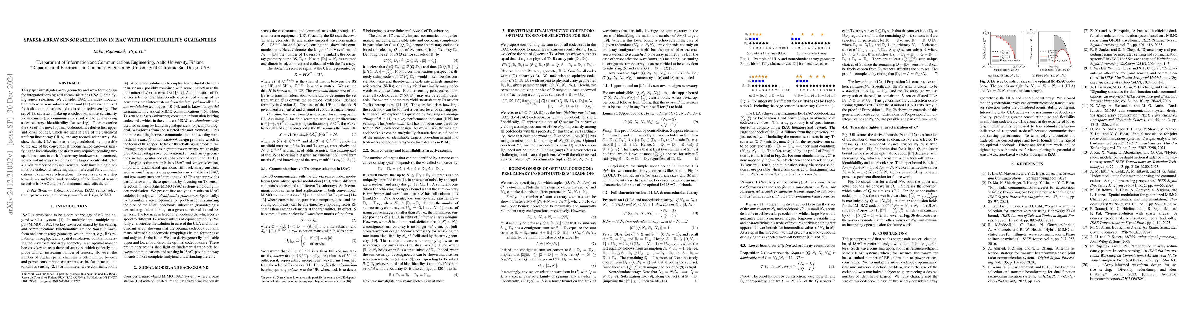 This paper investigates array geometry and waveform design for integrated sensing and communications (ISAC) employing sensor selection. We consider ISAC via index modulation, where various subsets of transmit (Tx) sensors are used for both communications and monostatic active sensing. The set of Tx subarrays make up a codebook, whose cardinality we maximize (for communications) subject to guaranteeing a desired target identifiability (for sensing). To characterize the size of this novel optimal codebook, we derive first upper and lower bounds, which are tight in case of the canonical uniform linear array (ULA) and any nonredundant array. We show that the ULA achieves a large codebook - comparable to the size of the conventional unconstrained case - as satisfying the identifiability constraint only requires including two specific sensors in each Tx subarray (codeword). In contrast, nonredundant arrays, which have the largest identifiability for a given number of physical sensors, only have a single admissible codeword, rendering them ineffectual for communications via sensor selection alone. The results serve as a step towards an analytical understanding of the limits of sensor selection in ISAC and the fundamental trade-offs therein.