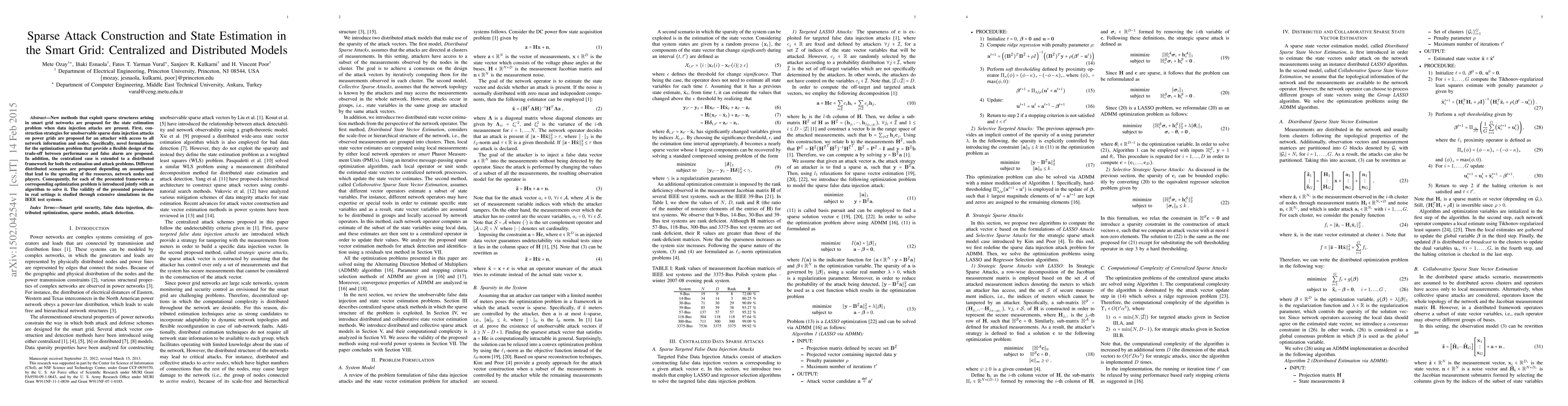 Researchers propose new methods to protect smart grids against data injection attacks by exploiting sparse structures in networks. They introduce flexible optimization frameworks for centralized and distributed models, enabling the trade-off between performance and false alarm detection.