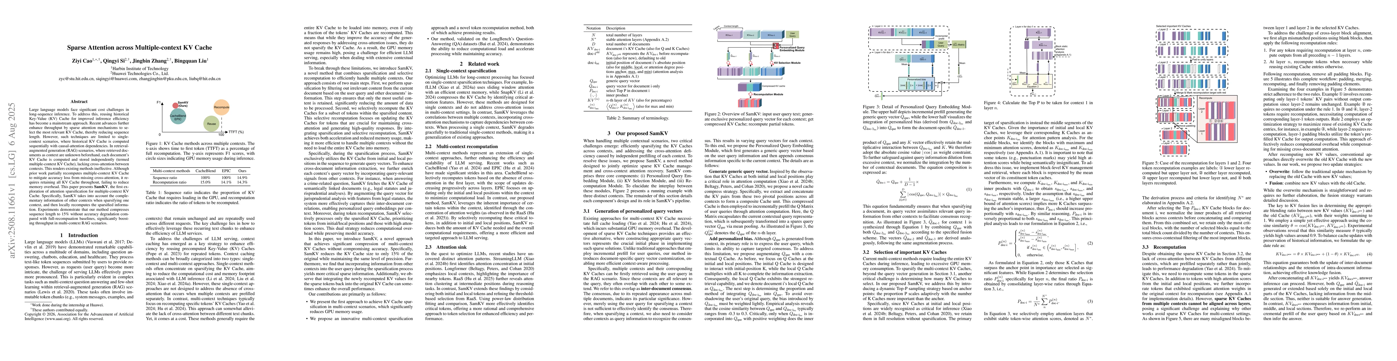 Large language models face significant cost challenges in long-sequence inference. To address this, reusing historical Key-Value (KV) Cache for improved inference efficiency has become a mainstream approach. Recent advances further enhance throughput by sparse attention mechanisms to select the most relevant KV Cache, thereby reducing sequence length. However, such techniques are limited to single-context scenarios, where historical KV Cache is computed sequentially with causal-attention dependencies. In retrieval-augmented generation (RAG) scenarios, where retrieved documents as context are unknown beforehand, each document's KV Cache is computed and stored independently (termed multiple-context KV Cache), lacking cross-attention between contexts. This renders existing methods ineffective. Although prior work partially recomputes multiple-context KV Cache to mitigate accuracy loss from missing cross-attention, it requires retaining all KV Cache throughout, failing to reduce memory overhead. This paper presents SamKV, the first exploration of attention sparsification for multiple-context KV Cache. Specifically, SamKV takes into account the complementary information of other contexts when sparsifying one context, and then locally recomputes the sparsified information. Experiments demonstrate that our method compresses sequence length to 15% without accuracy degradation compared with full-recompuation baselines, significantly boosting throughput in multi-context RAG scenarios.