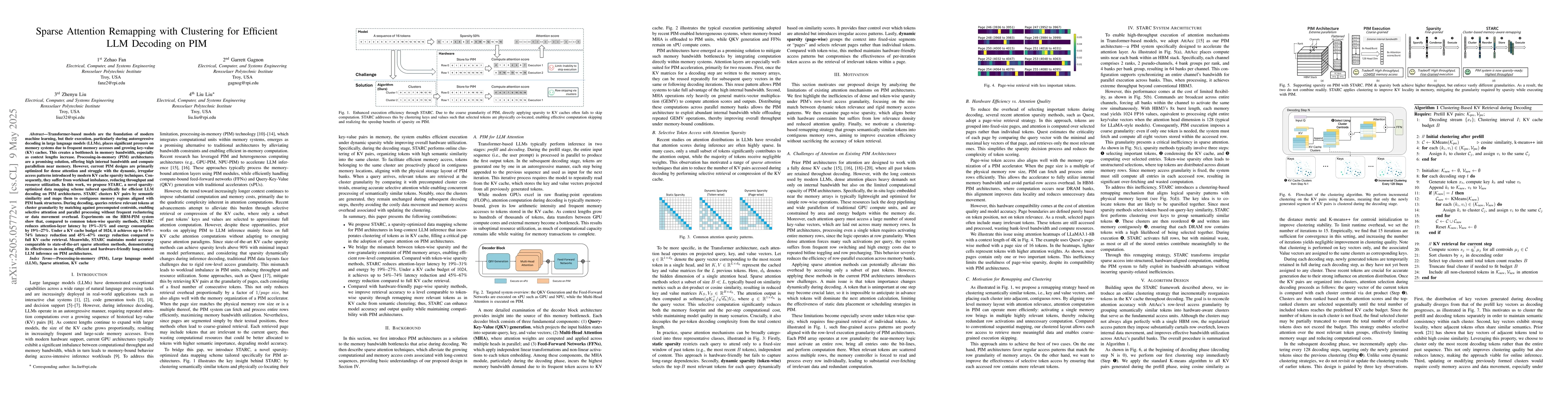 The paper proposes STARC, a sparsity-optimized data mapping scheme for efficient LLM decoding on PIM architectures, clustering KV pairs by semantic similarity and mapping them to contiguous memory regions aligned with PIM bank structures.