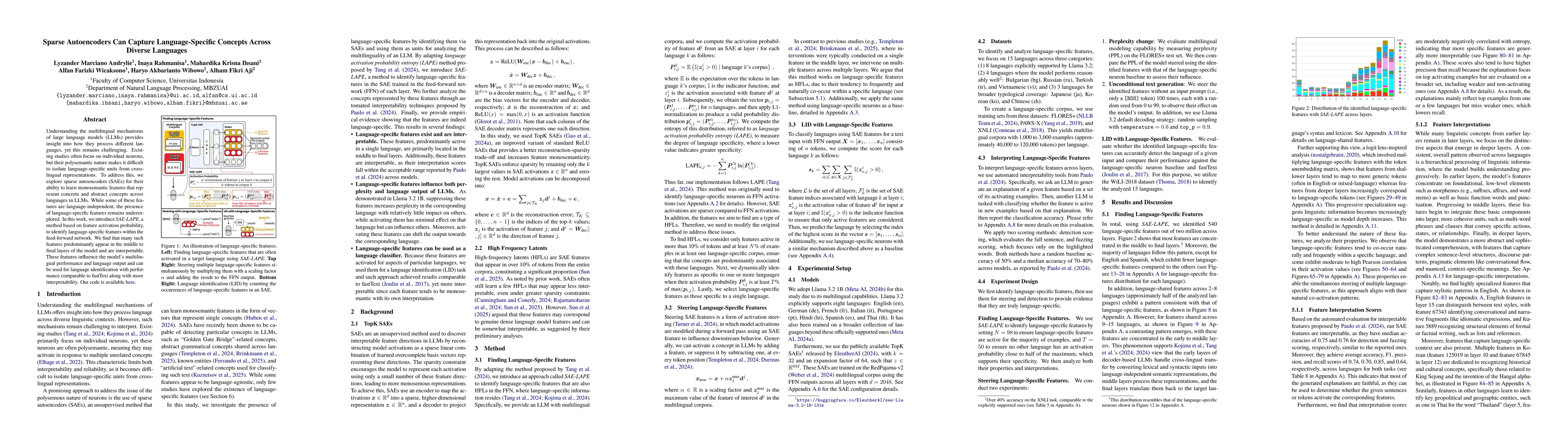Understanding the multilingual mechanisms of large language models (LLMs) provides insight into how they process different languages, yet this remains challenging. Existing studies often focus on individual neurons, but their polysemantic nature makes it difficult to isolate language-specific units from cross-lingual representations. To address this, we explore sparse autoencoders (SAEs) for their ability to learn monosemantic features that represent concrete and abstract concepts across languages in LLMs. While some of these features are language-independent, the presence of language-specific features remains underexplored. In this work, we introduce SAE-LAPE, a method based on feature activation probability, to identify language-specific features within the feed-forward network. We find that many such features predominantly appear in the middle to final layers of the model and are interpretable. These features influence the model's multilingual performance and language output and can be used for language identification with performance comparable to fastText along with more interpretability. Our code is available at https://github.com/LyzanderAndrylie/language-specific-features .