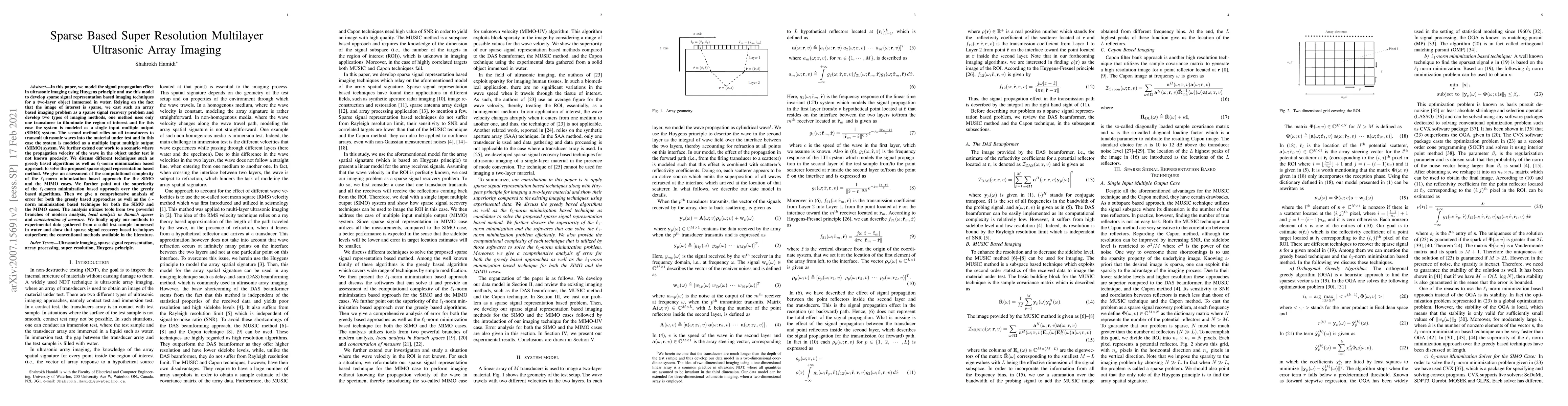 In this paper, we model the signal propagation effect in ultrasonic imaging using Huygens principle and use this model to develop sparse signal representation based imaging techniques for a two-layer object immersed in water. Relying on the fact that the image of interest is sparse, we cast such an array based imaging problem as a sparse signal recovery problem and develop two types of imaging methods, one method uses only one transducer to illuminate the region of interest {and for this case the system is modeled as a single input multiple output (SIMO) system. The second method relies on all transducers to transmit ultrasonic waves into the material under test and in this case the system is modeled as a multiple input multiple output (MIMO) system}. We further extend our work to a scenario where the propagation velocity of the wave in the object under test is not known precisely. {We discuss different techniques such as greedy based algorithms as well as $\ell_1$-norm minimization based approach to solve the proposed sparse signal representation based method. We give an assessment of the computational complexity of the $\ell_1$-norm minimization based approach for the SIMO and the MIMO cases. We further point out the superiority of the $\ell_1$-norm minimization based approach over the greedy based algorithms. Then we give a comprehensive analysis of error for both the greedy based approaches as well as the $\ell_1$-norm minimization based technique for both the SIMO and the MIMO cases. The analysis utilizes tools from two powerful branches of modern analysis, \emph{local analysis in Banach spaces} and \emph{concentration of measure}}. We finally apply our methods to experimental data gathered from a solid test sample immersed in water and show that sparse signal recovery based techniques outperform the conventional methods available in the literature.