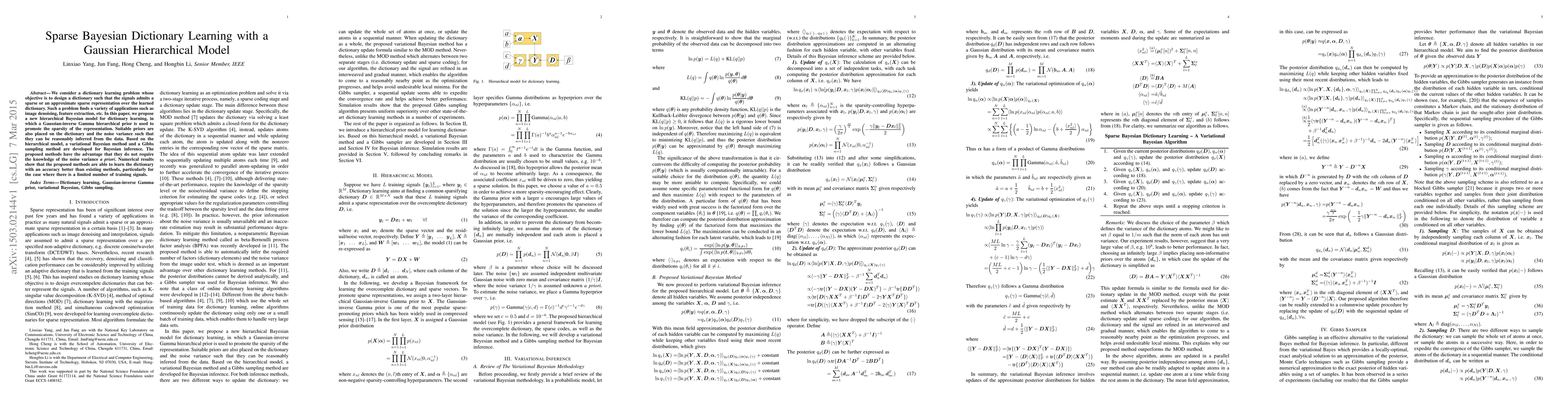 This paper proposes a sparse Bayesian dictionary learning method using a Gaussian hierarchical model to promote sparse representations. The method employs variational Bayesian and Gibbs sampling techniques for inference, without requiring prior knowledge of noise variance, and demonstrates superior performance in dictionary learning accuracy.