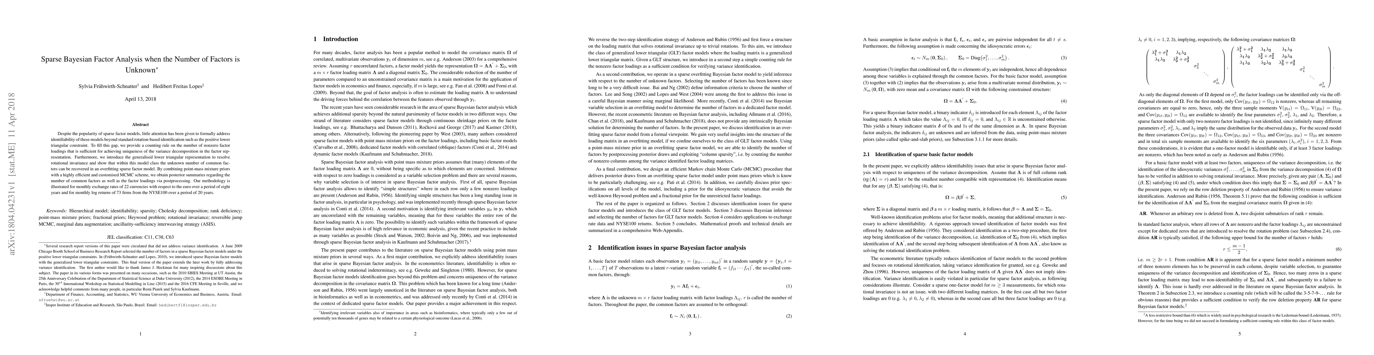 Despite the popularity of sparse factor models, little attention has been given to formally address identifiability of these models beyond standard rotation-based identification such as the positive lower triangular constraint. To fill this gap, we provide a counting rule on the number of nonzero factor loadings that is sufficient for achieving uniqueness of the variance decomposition in the factor representation. Furthermore, we introduce the generalised lower triangular representation to resolve rotational invariance and show that within this model class the unknown number of common factors can be recovered in an overfitting sparse factor model. By combining point-mass mixture priors with a highly efficient and customised MCMC scheme, we obtain posterior summaries regarding the number of common factors as well as the factor loadings via postprocessing. Our methodology is illustrated for monthly exchange rates of 22 currencies with respect to the euro over a period of eight years and for monthly log returns of 73 firms from the NYSE100 over a period of 20 years.