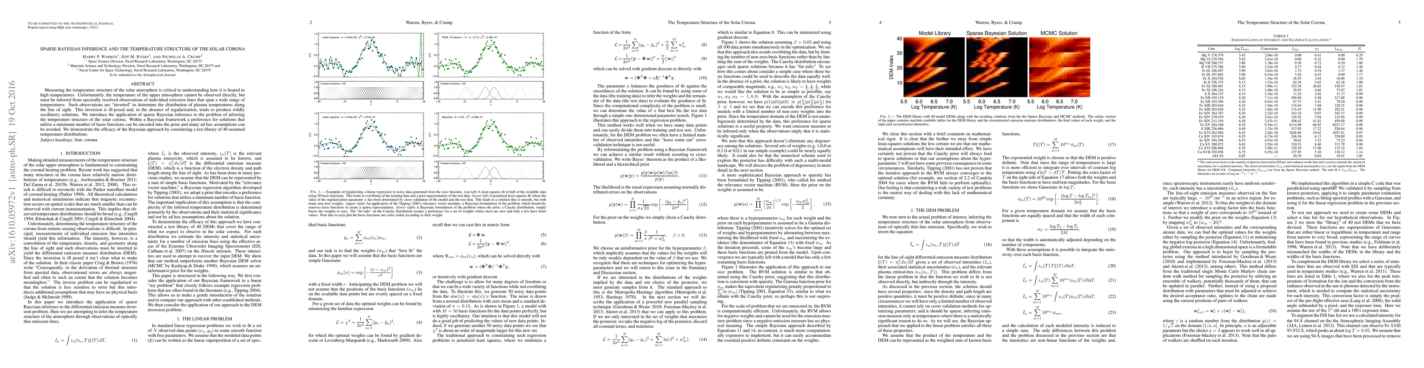 Measuring the temperature structure of the solar atmosphere is critical to understanding how it is heated to high temperatures. Unfortunately, the temperature of the upper atmosphere cannot be observed directly, but must be inferred from spectrally resolved observations of individual emission lines that span a wide range of temperatures. Such observations are "inverted" to determine the distribution of plasma temperatures along the line of sight. This inversion is ill-posed and, in the absence of regularization, tends to produce wildly oscillatory solutions. We introduce the application of sparse Bayesian inference to the problem of inferring the temperature structure of the solar corona. Within a Bayesian framework a preference for solutions that utilize a minimum number of basis functions can be encoded into the prior and many ad hoc assumptions can be avoided. We demonstrate the efficacy of the Bayesian approach by considering a test library of 40 assumed temperature distributions.