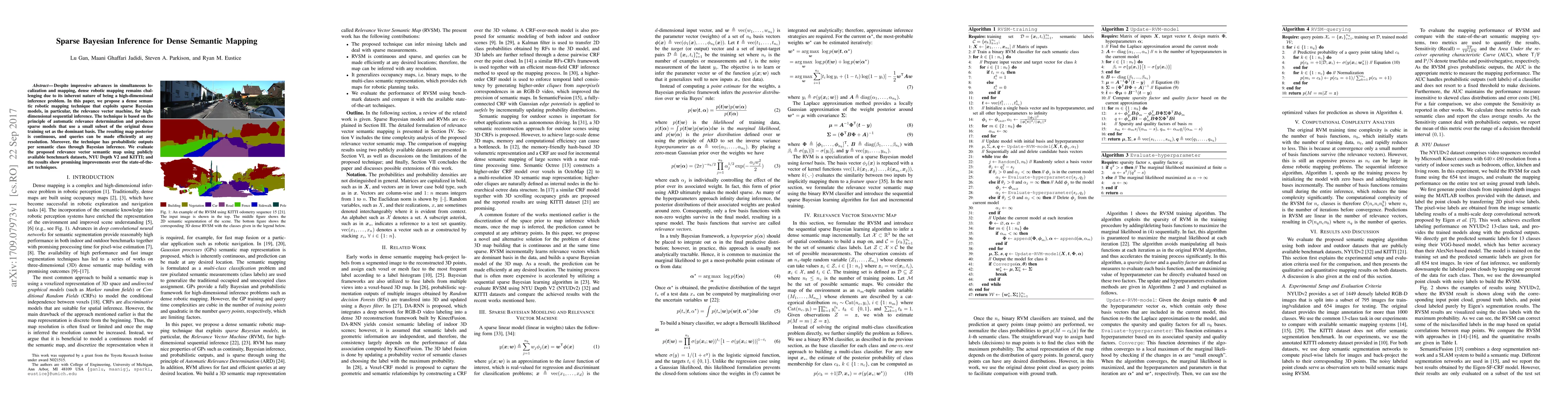 This paper proposes a dense semantic mapping technique using sparse Bayesian inference, specifically relevance vector machines, to tackle high-dimensional mapping challenges. The method produces efficient, continuous maps with probabilistic semantic outputs, demonstrating improvements over existing techniques on NYU Depth V2 and KITTI datasets.