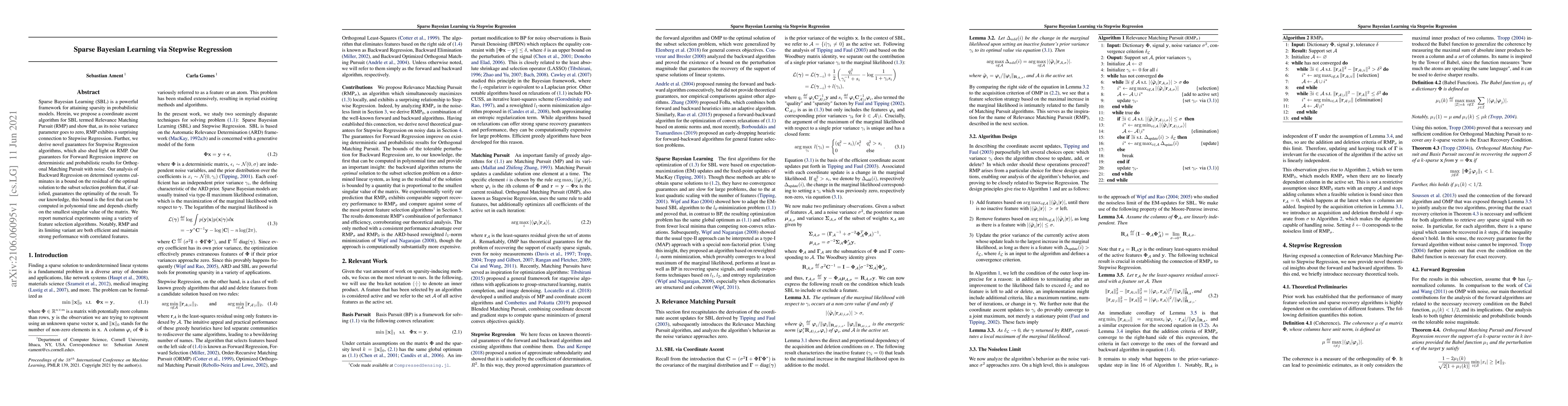 This paper proposes a Relevance Matching Pursuit (RMP) algorithm for Sparse Bayesian Learning, demonstrating a connection between RMP and Stepwise Regression as noise variance approaches zero. It provides novel guarantees for Stepwise Regression, notably improving on existing results for Forward Regression and introducing a polynomial-time computable bound for Backward Regression based on matrix singular values.