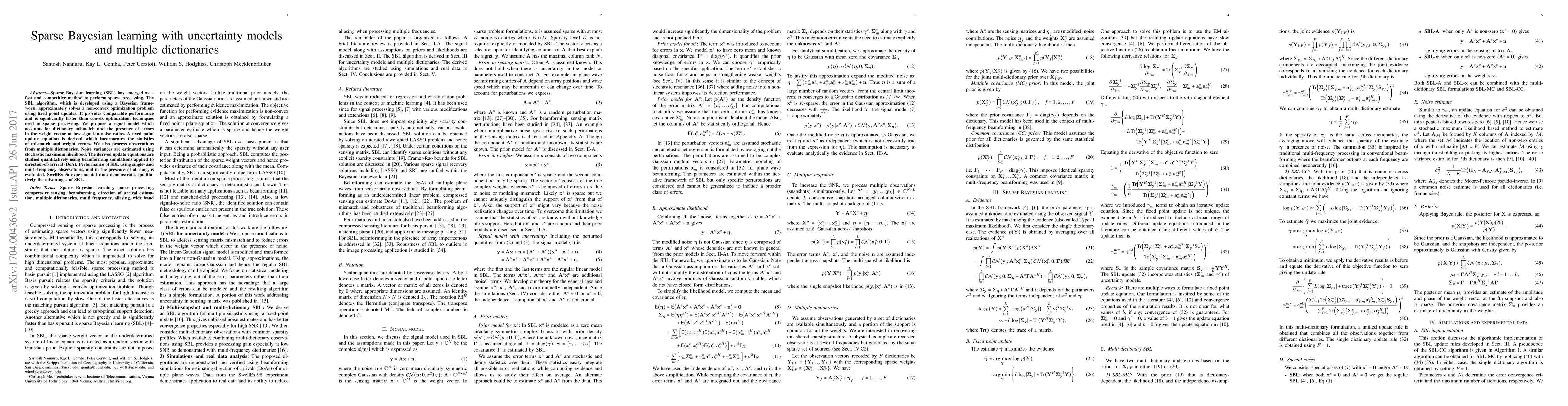 Sparse Bayesian learning (SBL) has emerged as a fast and competitive method to perform sparse processing. The SBL algorithm, which is developed using a Bayesian framework, approximately solves a non-convex optimization problem using fixed point updates. It provides comparable performance and is significantly faster than convex optimization techniques used in sparse processing. We propose a signal model which accounts for dictionary mismatch and the presence of errors in the weight vector at low signal-to-noise ratios. A fixed point update equation is derived which incorporates the statistics of mismatch and weight errors. We also process observations from multiple dictionaries. Noise variances are estimated using stochastic maximum likelihood. The derived update equations are studied quantitatively using beamforming simulations applied to direction-of-arrival (DoA). Performance of SBL using single- and multi-frequency observations, and in the presence of aliasing, is evaluated. SwellEx-96 experimental data demonstrates qualitatively the advantages of SBL.