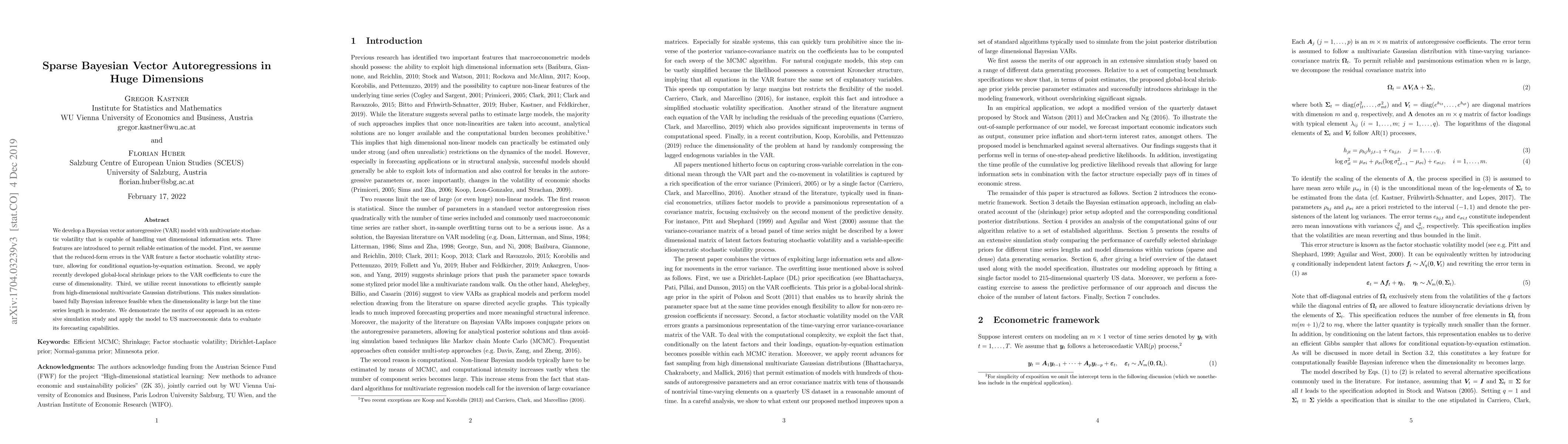 We develop a Bayesian vector autoregressive (VAR) model with multivariate stochastic volatility that is capable of handling vast dimensional information sets. Three features are introduced to permit reliable estimation of the model. First, we assume that the reduced-form errors in the VAR feature a factor stochastic volatility structure, allowing for conditional equation-by-equation estimation. Second, we apply recently developed global-local shrinkage priors to the VAR coefficients to cure the curse of dimensionality. Third, we utilize recent innovations to efficiently sample from high-dimensional multivariate Gaussian distributions. This makes simulation-based fully Bayesian inference feasible when the dimensionality is large but the time series length is moderate. We demonstrate the merits of our approach in an extensive simulation study and apply the model to US macroeconomic data to evaluate its forecasting capabilities.