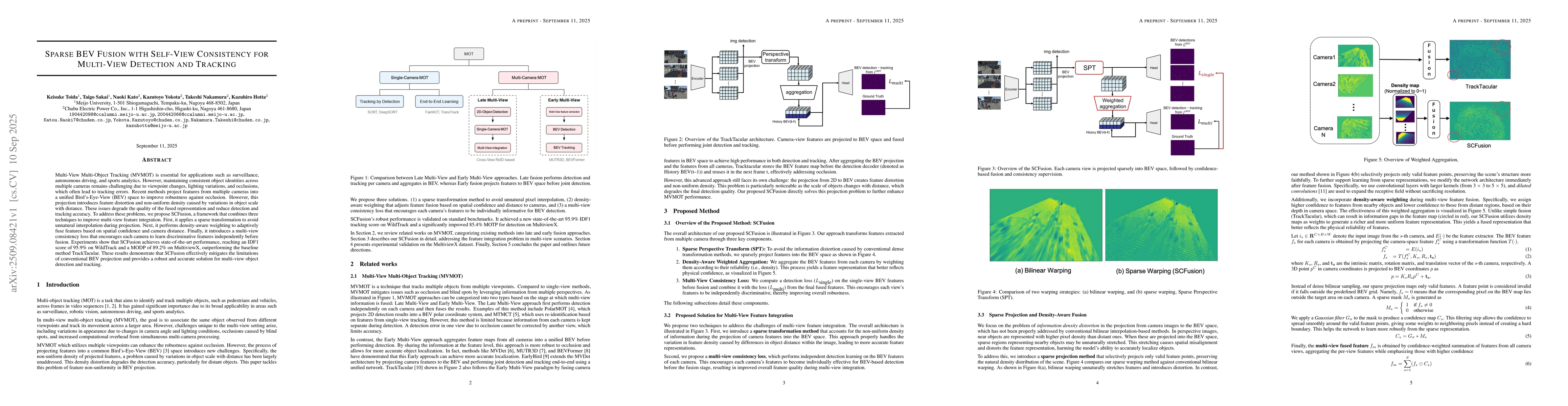 Multi-View Multi-Object Tracking (MVMOT) is essential for applications such as surveillance, autonomous driving, and sports analytics. However, maintaining consistent object identities across multiple cameras remains challenging due to viewpoint changes, lighting variations, and occlusions, which often lead to tracking errors.Recent methods project features from multiple cameras into a unified Bird's-Eye-View (BEV) space to improve robustness against occlusion. However, this projection introduces feature distortion and non-uniform density caused by variations in object scale with distance. These issues degrade the quality of the fused representation and reduce detection and tracking accuracy.To address these problems, we propose SCFusion, a framework that combines three techniques to improve multi-view feature integration. First, it applies a sparse transformation to avoid unnatural interpolation during projection. Next, it performs density-aware weighting to adaptively fuse features based on spatial confidence and camera distance. Finally, it introduces a multi-view consistency loss that encourages each camera to learn discriminative features independently before fusion.Experiments show that SCFusion achieves state-of-the-art performance, reaching an IDF1 score of 95.9% on WildTrack and a MODP of 89.2% on MultiviewX, outperforming the baseline method TrackTacular. These results demonstrate that SCFusion effectively mitigates the limitations of conventional BEV projection and provides a robust and accurate solution for multi-view object detection and tracking.