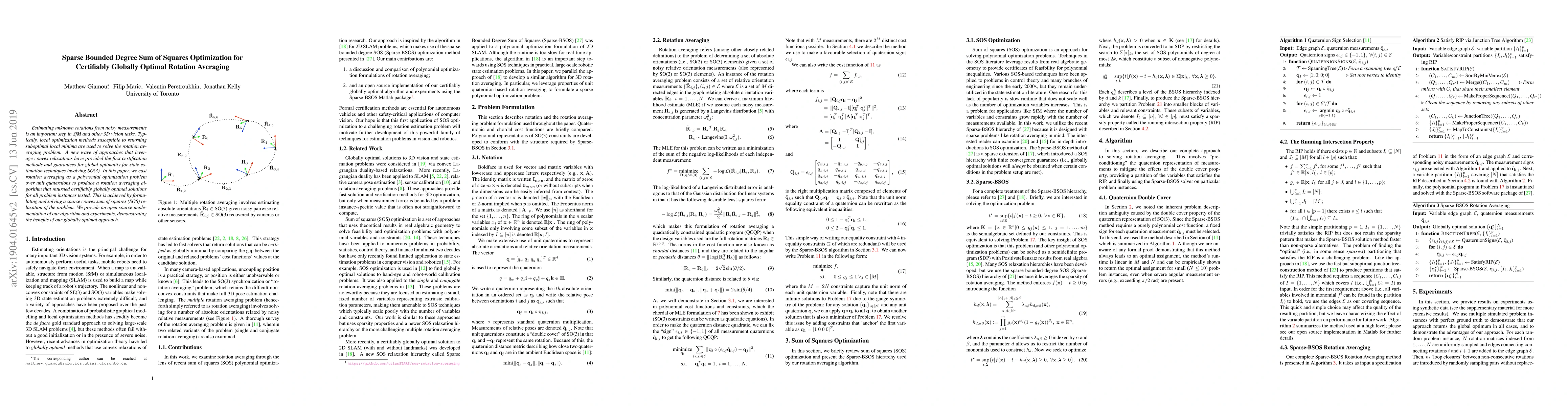 This paper presents a novel sparse bounded degree sum of squares optimization method for achieving certifiably globally optimal rotation averaging in 3D vision tasks, overcoming limitations of local optimization methods. The approach formulates the problem as a convex relaxation over unit quaternions and provides an open-source implementation with experimental results demonstrating its advantages.