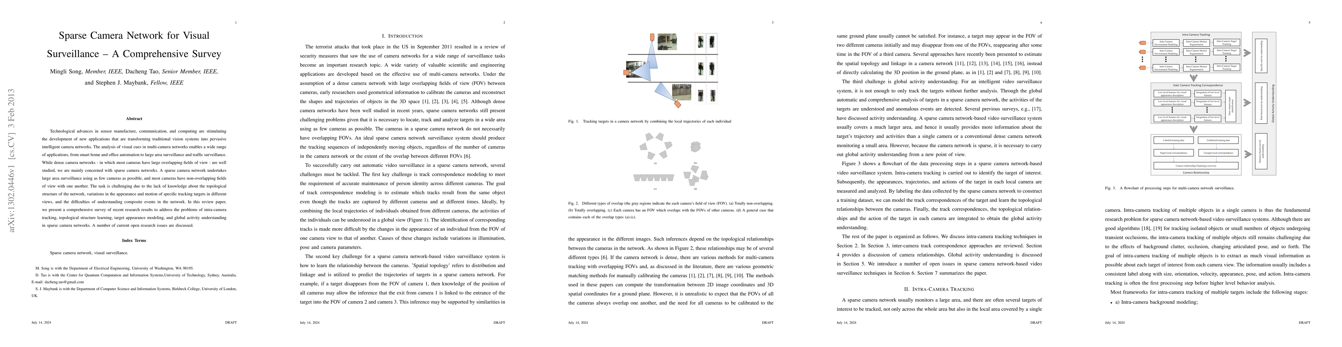 This paper provides a comprehensive survey on sparse camera networks for visual surveillance, focusing on challenges like intra-camera tracking, topological structure learning, target appearance modeling, and global activity understanding. The review highlights current open research issues in this emerging field.