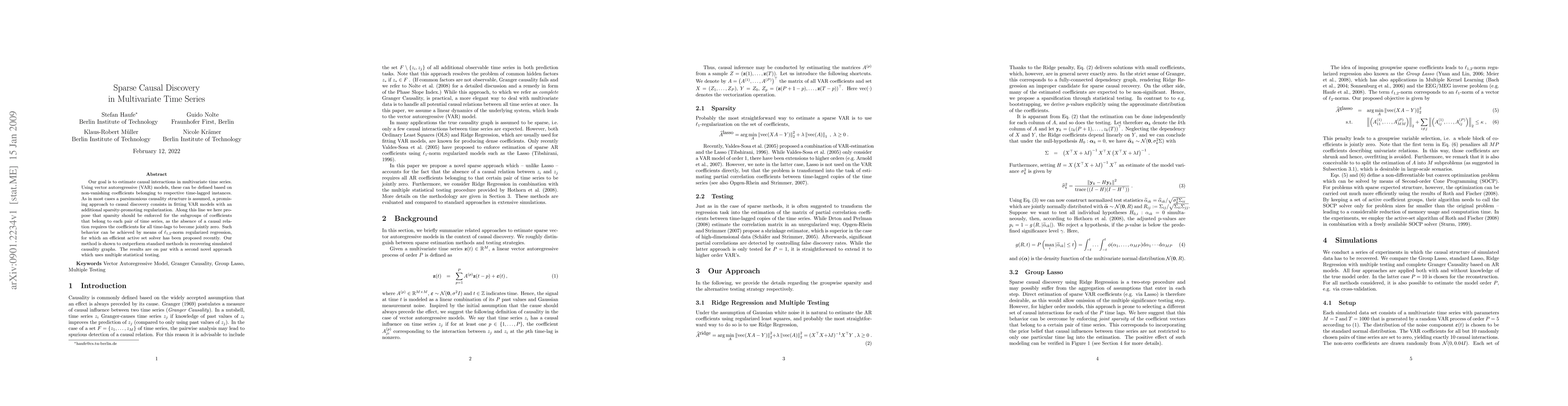 This paper proposes a method for estimating causal interactions in multivariate time series using vector autoregressive models with sparsity-promoting regularization. The method enforces sparsity for subgroups of coefficients to identify non-causal relationships, achieving better performance than standard methods in simulated tests.