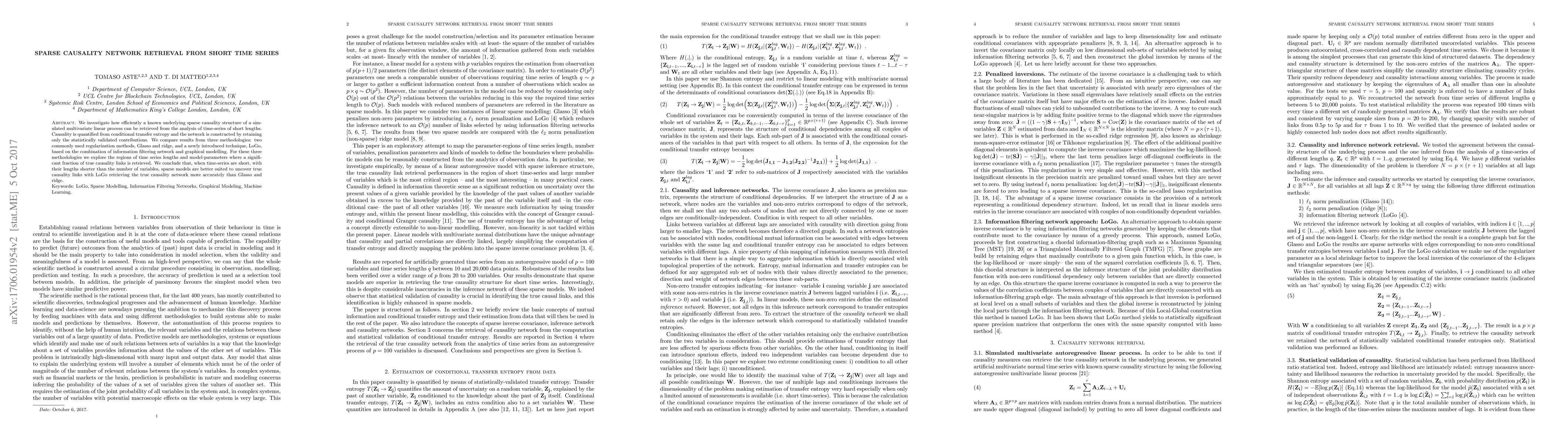 This research evaluates the efficiency of retrieving sparse causality networks from short time series using conditional transfer entropy. It compares three methodologies: Glasso, ridge, and a new LoGo technique, finding that LoGo is superior in accurately uncovering true causality links when time series lengths are shorter than the number of variables.