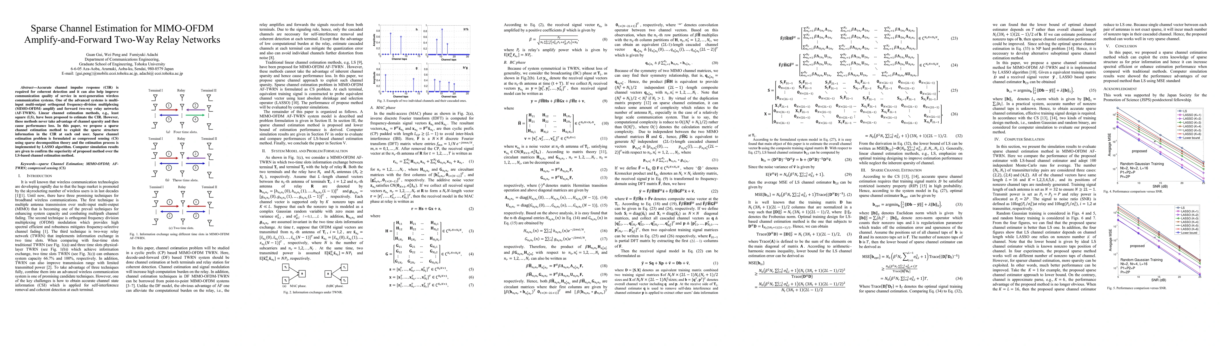 This paper proposes a sparse channel estimation method for MIMO-OFDM AF-TWRN systems to leverage channel sparsity, using compressed sensing with the LASSO algorithm. Simulation results show its superiority over traditional least square-based methods.