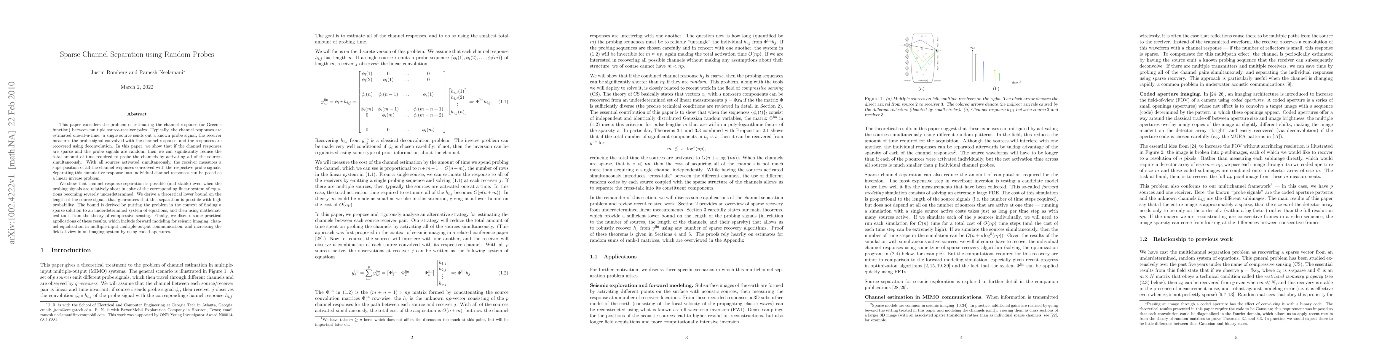 This paper considers the problem of estimating the channel response (or Green's function) between multiple source-receiver pairs. Typically, the channel responses are estimated one-at-a-time: a single source sends out a known probe signal, the receiver measures the probe signal convolved with the channel response, and the responses are recovered using deconvolution. In this paper, we show that if the channel responses are sparse and the probe signals are random, then we can significantly reduce the total amount of time required to probe the channels by activating all of the sources simultaneously. With all sources activated simultaneously, the receiver measures a superposition of all the channel responses convolved with the respective probe signals. Separating this cumulative response into individual channel responses can be posed as a linear inverse problem. We show that channel response separation is possible (and stable) even when the probing signals are relatively short in spite of the corresponding linear system of equations becoming severely underdetermined. We derive a theoretical lower bound on the length of the source signals that guarantees that this separation is possible with high probability. The bound is derived by putting the problem in the context of finding a sparse solution to an underdetermined system of equations, and then using mathematical tools from the theory of compressive sensing. Finally, we discuss some practical applications of these results, which include forward modeling for seismic imaging, channel equalization in multiple-input multiple-output communication, and increasing the field-of-view in an imaging system by using coded apertures.