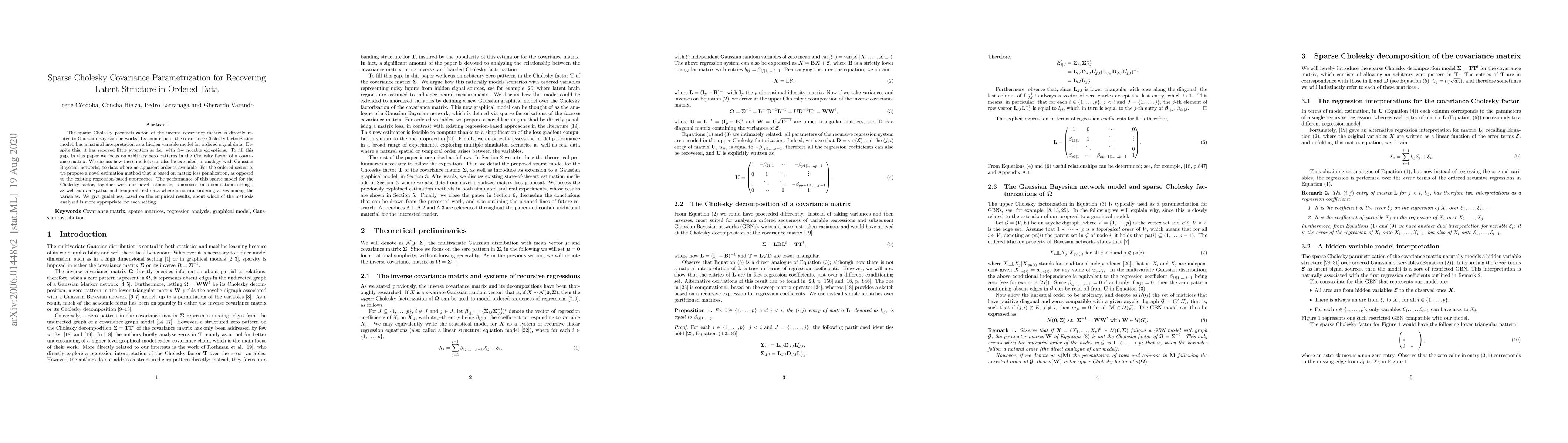 The sparse Cholesky parametrization of the inverse covariance matrix can be interpreted as a Gaussian Bayesian network; however its counterpart, the covariance Cholesky factor, has received, with few notable exceptions, little attention so far, despite having a natural interpretation as a hidden variable model for ordered signal data. To fill this gap, in this paper we focus on arbitrary zero patterns in the Cholesky factor of a covariance matrix. We discuss how these models can also be extended, in analogy with Gaussian Bayesian networks, to data where no apparent order is available. For the ordered scenario, we propose a novel estimation method that is based on matrix loss penalization, as opposed to the existing regression-based approaches. The performance of this sparse model for the Cholesky factor, together with our novel estimator, is assessed in a simulation setting, as well as over spatial and temporal real data where a natural ordering arises among the variables. We give guidelines, based on the empirical results, about which of the methods analysed is more appropriate for each setting.