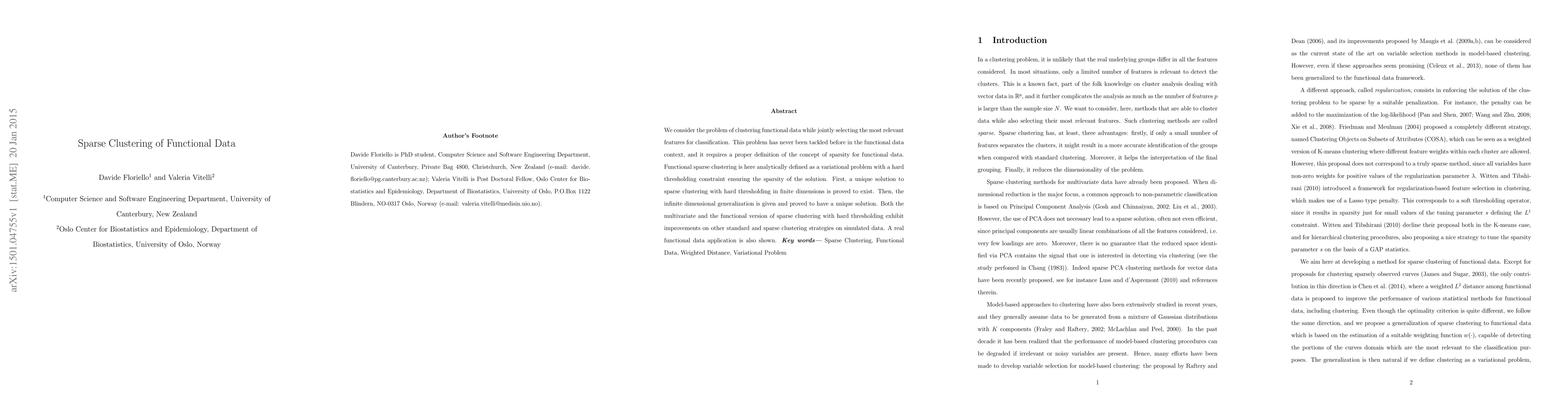 This paper introduces a novel method for sparse clustering of functional data, defining sparsity through a variational problem with hard thresholding. It proves the existence of a unique solution in both finite and infinite dimensions, demonstrating improvements over standard clustering methods on simulated data and showcasing a real-world application.