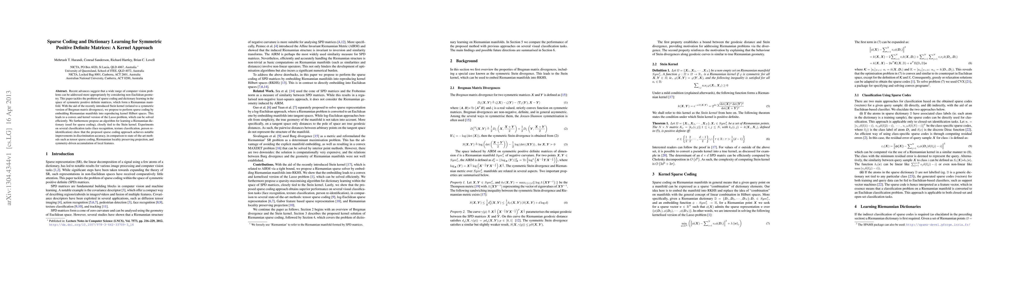 This paper proposes a kernel approach for sparse coding and dictionary learning on the space of symmetric positive definite matrices using the Stein kernel. The method embeds Riemannian manifolds into reproducing kernel Hilbert spaces, leading to a convex kernel Lasso problem and an efficient algorithm for dictionary learning, which shows improved classification accuracy in tasks like face recognition and texture classification.