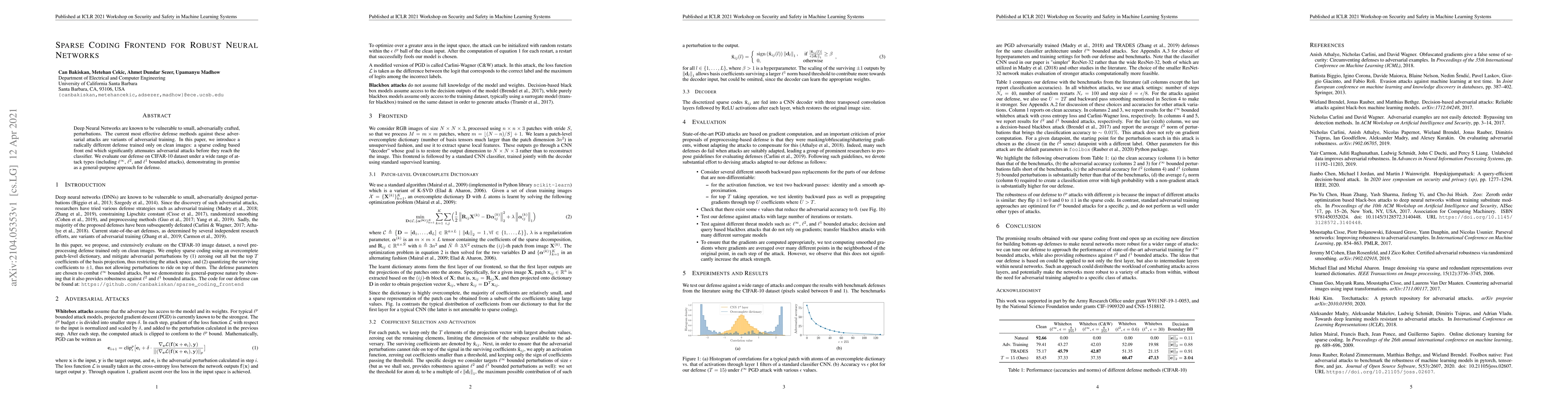 This paper proposes a sparse coding frontend to defend neural networks against adversarial attacks by attenuating perturbations before they reach the classifier, showing effectiveness across various attack types on the CIFAR-10 dataset.