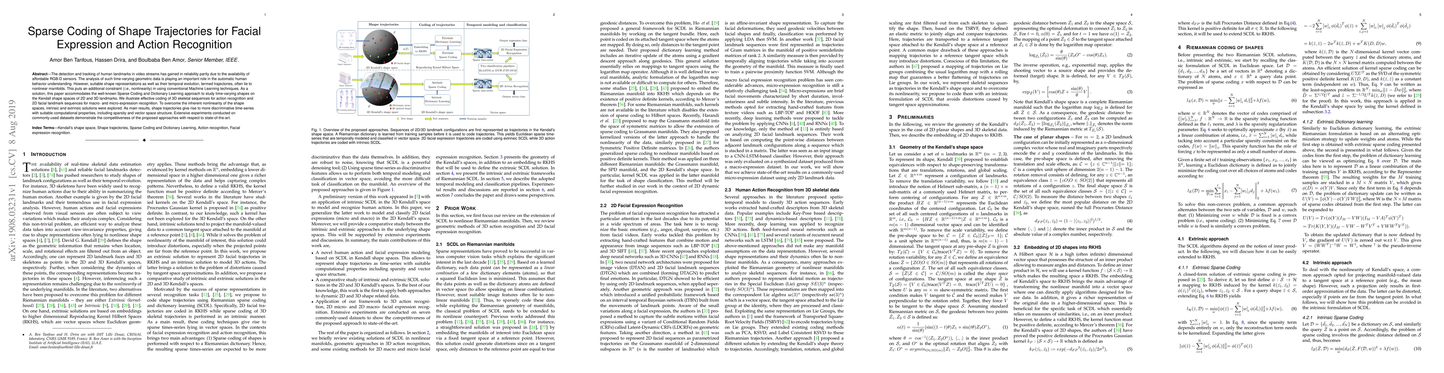 This paper proposes using sparse coding and dictionary learning on Kendall shape spaces to analyze time-varying geometric data for facial expression and action recognition. The approach effectively captures the nonlinearity of shape trajectories, leading to more discriminative time-series representations and competitive performance on standard datasets.