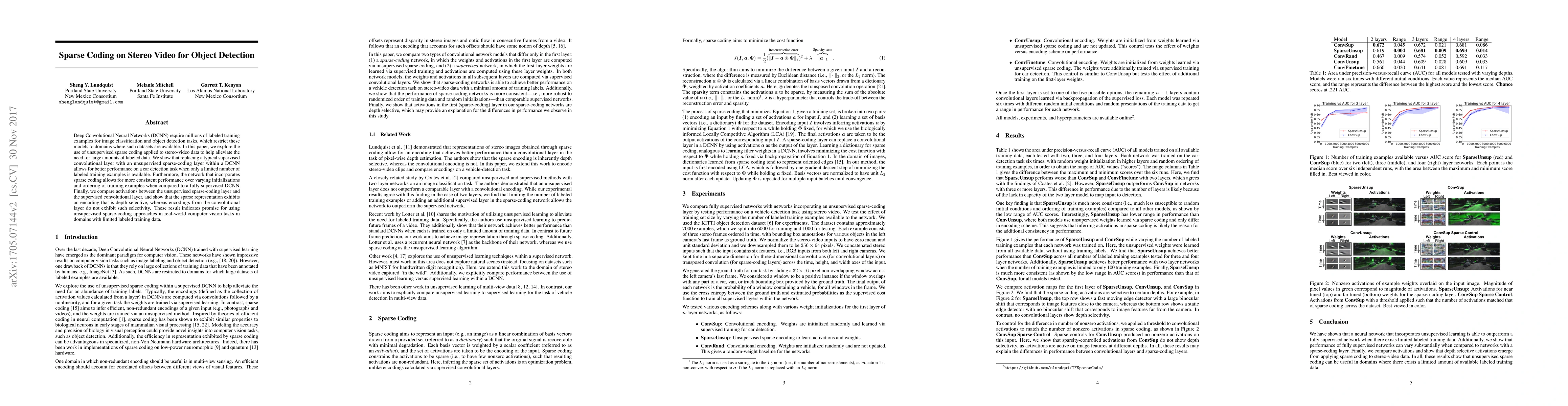 Deep Convolutional Neural Networks (DCNN) require millions of labeled training examples for image classification and object detection tasks, which restrict these models to domains where such datasets are available. In this paper, we explore the use of unsupervised sparse coding applied to stereo-video data to help alleviate the need for large amounts of labeled data. We show that replacing a typical supervised convolutional layer with an unsupervised sparse-coding layer within a DCNN allows for better performance on a car detection task when only a limited number of labeled training examples is available. Furthermore, the network that incorporates sparse coding allows for more consistent performance over varying initializations and ordering of training examples when compared to a fully supervised DCNN. Finally, we compare activations between the unsupervised sparse-coding layer and the supervised convolutional layer, and show that the sparse representation exhibits an encoding that is depth selective, whereas encodings from the convolutional layer do not exhibit such selectivity. These result indicates promise for using unsupervised sparse-coding approaches in real-world computer vision tasks in domains with limited labeled training data.