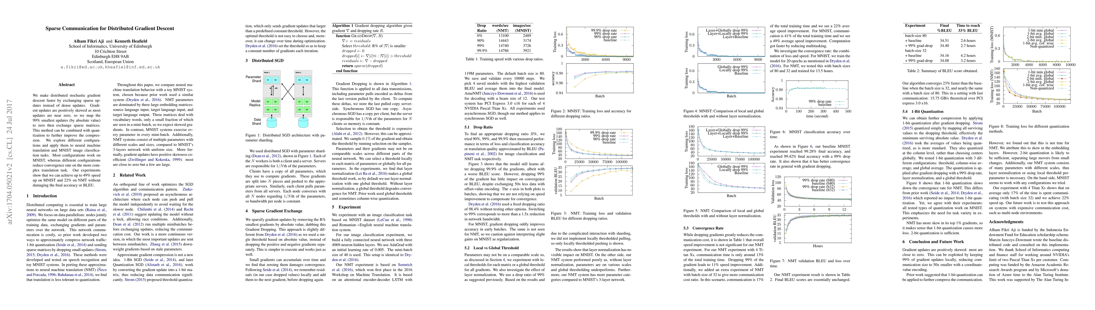 Researchers developed a method to speed up distributed gradient descent by exchanging sparse updates instead of dense ones, achieving up to 49% speedup on MNIST without compromising accuracy.
