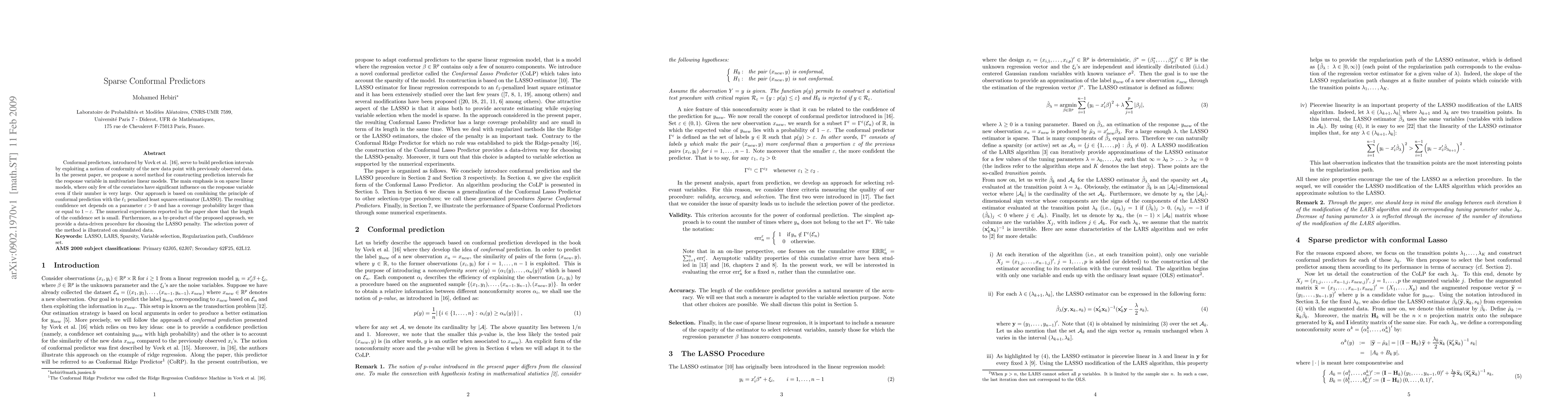 Conformal predictors, introduced by Vovk et al. (2005), serve to build prediction intervals by exploiting a notion of conformity of the new data point with previously observed data. In the present paper, we propose a novel method for constructing prediction intervals for the response variable in multivariate linear models. The main emphasis is on sparse linear models, where only few of the covariates have significant influence on the response variable even if their number is very large. Our approach is based on combining the principle of conformal prediction with the $\ell_1$ penalized least squares estimator (LASSO). The resulting confidence set depends on a parameter $\epsilon>0$ and has a coverage probability larger than or equal to $1-\epsilon$. The numerical experiments reported in the paper show that the length of the confidence set is small. Furthermore, as a by-product of the proposed approach, we provide a data-driven procedure for choosing the LASSO penalty. The selection power of the method is illustrated on simulated data.