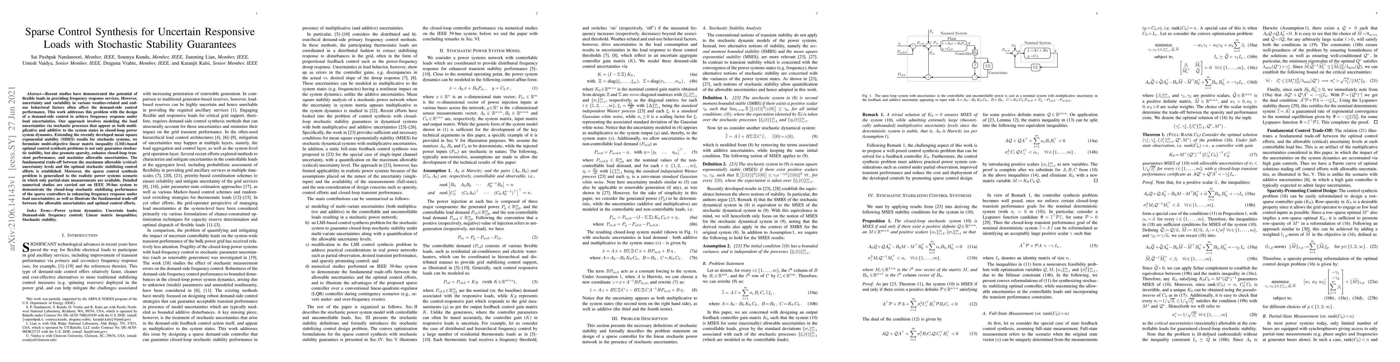 This paper proposes a sparse control synthesis method for managing uncertain responsive loads in power systems, ensuring stochastic stability under load variability. The approach formulates optimal control problems using LMIs to balance stability, sparsity, and performance while maximizing allowable uncertainties, validated through numerical studies on an IEEE 39-bus system.