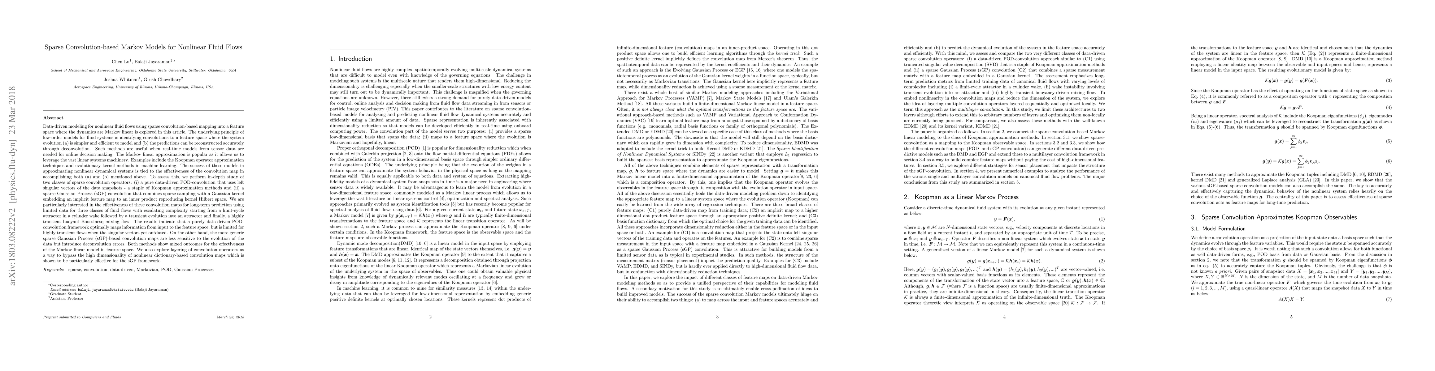 Data-driven modeling for nonlinear fluid flows using sparse convolution-based mapping into a feature space where the dynamics are Markov linear is explored in this article. The underlying principle of low-order models for fluid systems is identifying convolutions to a feature space where the system evolution (a) is simpler and efficient to model and (b) the predictions can be reconstructed accurately through deconvolution. Such methods are useful when real-time models from sensor data are needed for online decision making. The Markov linear approximation is popular as it allows us to leverage the vast linear systems machinery. Examples include the Koopman operator approximation techniques and evolutionary kernel methods in machine learning. The success of these models in approximating nonlinear dynamical systems is tied to the effectiveness of the convolution map in accomplishing both (a) and (b) mentioned above. To assess this, we perform in-depth study of two classes of sparse convolution operators: (i) a pure data-driven POD-convolution that uses left singular vectors of the data snapshots - a staple of Koopman approximation methods and (ii) a sparse Gaussian Process (sGP) convolution that combines sparse sampling with a Gaussian kernel embedding an implicit feature map to an inner product reproducing kernel Hilbert space.