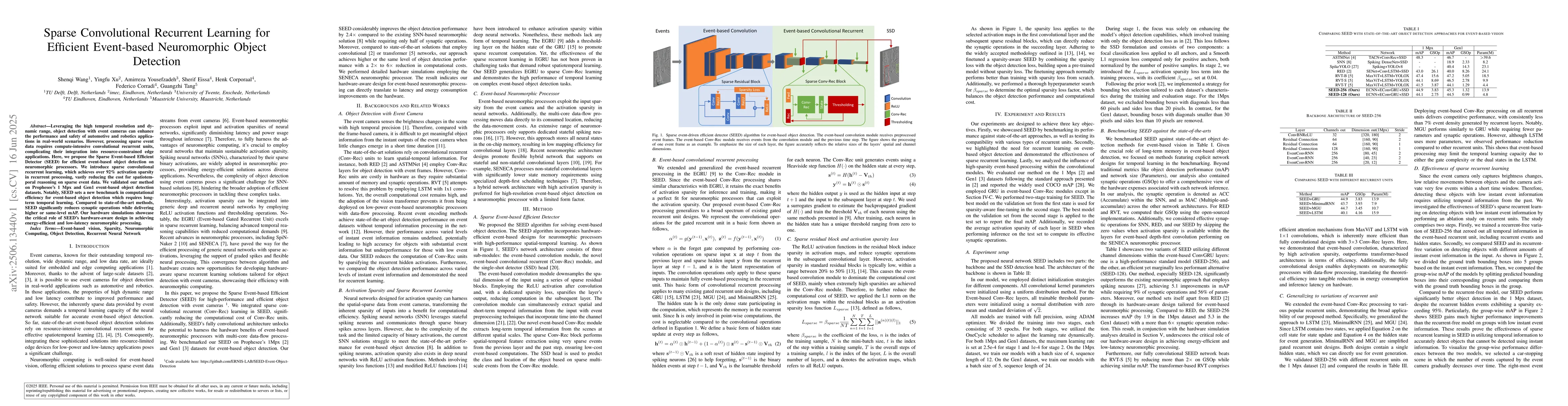 Leveraging the high temporal resolution and dynamic range, object detection with event cameras can enhance the performance and safety of automotive and robotics applications in real-world scenarios. However, processing sparse event data requires compute-intensive convolutional recurrent units, complicating their integration into resource-constrained edge applications. Here, we propose the Sparse Event-based Efficient Detector (SEED) for efficient event-based object detection on neuromorphic processors. We introduce sparse convolutional recurrent learning, which achieves over 92% activation sparsity in recurrent processing, vastly reducing the cost for spatiotemporal reasoning on sparse event data. We validated our method on Prophesee's 1 Mpx and Gen1 event-based object detection datasets. Notably, SEED sets a new benchmark in computational efficiency for event-based object detection which requires long-term temporal learning. Compared to state-of-the-art methods, SEED significantly reduces synaptic operations while delivering higher or same-level mAP. Our hardware simulations showcase the critical role of SEED's hardware-aware design in achieving energy-efficient and low-latency neuromorphic processing.