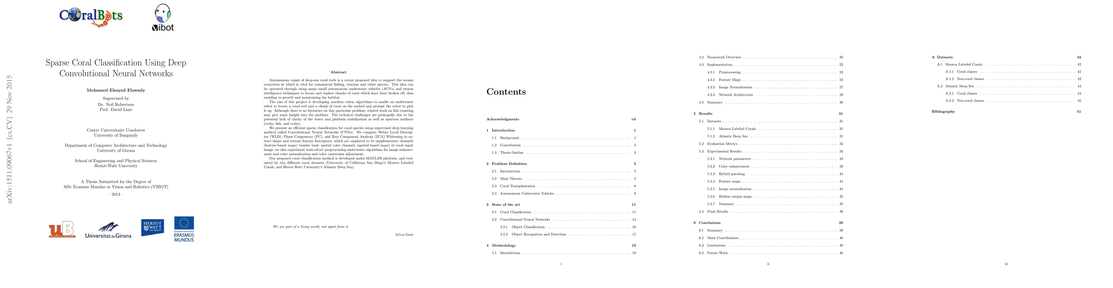 This research develops a Convolutional Neural Network (CNN) for classifying sparse coral species using deep learning. The study utilizes feature descriptors and preprocessing algorithms to enhance coral image clarity and applies the method to two coral datasets for evaluation.