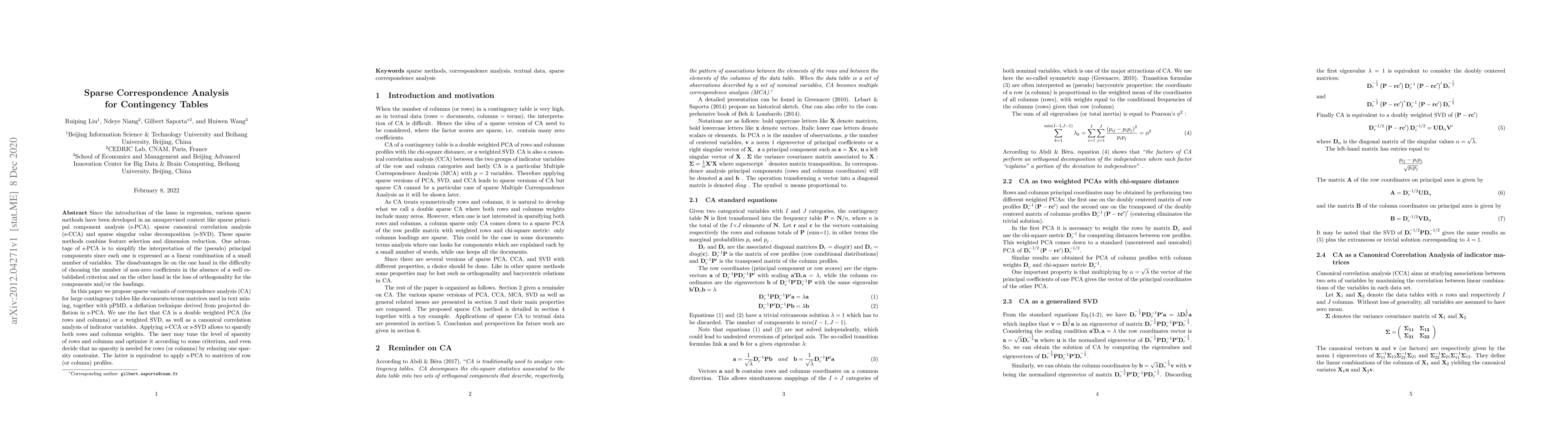 Since the introduction of the lasso in regression, various sparse methods have been developed in an unsupervised context like sparse principal component analysis (s-PCA), sparse canonical correlation analysis (s-CCA) and sparse singular value decomposition (s-SVD). These sparse methods combine feature selection and dimension reduction. One advantage of s-PCA is to simplify the interpretation of the (pseudo) principal components since each one is expressed as a linear combination of a small number of variables. The disadvantages lie on the one hand in the difficulty of choosing the number of non-zero coefficients in the absence of a well established criterion and on the other hand in the loss of orthogonality for the components and/or the loadings. In this paper we propose sparse variants of correspondence analysis (CA)for large contingency tables like documents-terms matrices used in text mining, together with pPMD, a deation technique derived from projected deflation in s-PCA. We use the fact that CA is a double weighted PCA (for rows and columns) or a weighted SVD, as well as a canonical correlation analysis of indicator variables. Applying s-CCA or s-SVD allows to sparsify both rows and columns weights. The user may tune the level of sparsity of rows and columns and optimize it according to some criterium, and even decide that no sparsity is needed for rows (or columns) by relaxing one sparsity constraint. The latter is equivalent to apply s-PCA to matrices of row (or column) profiles.