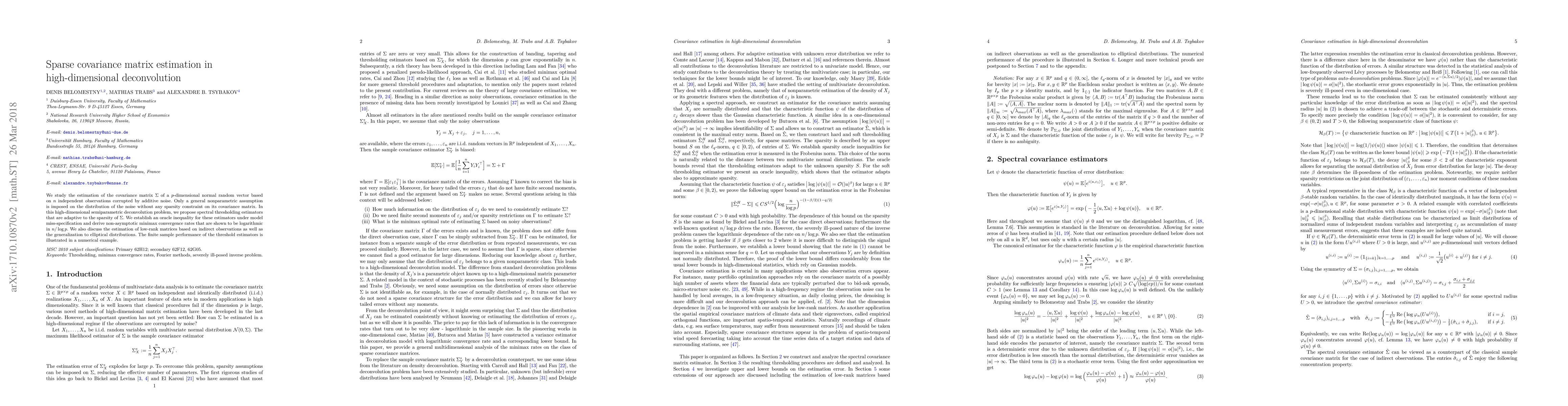 This paper proposes spectral thresholding estimators for estimating the sparse covariance matrix $\Sigma$ in high-dimensional deconvolution problems, establishing oracle inequalities and minimax convergence rates. The method is adaptive to the sparsity of $\Sigma$ and generalizes to elliptical distributions.