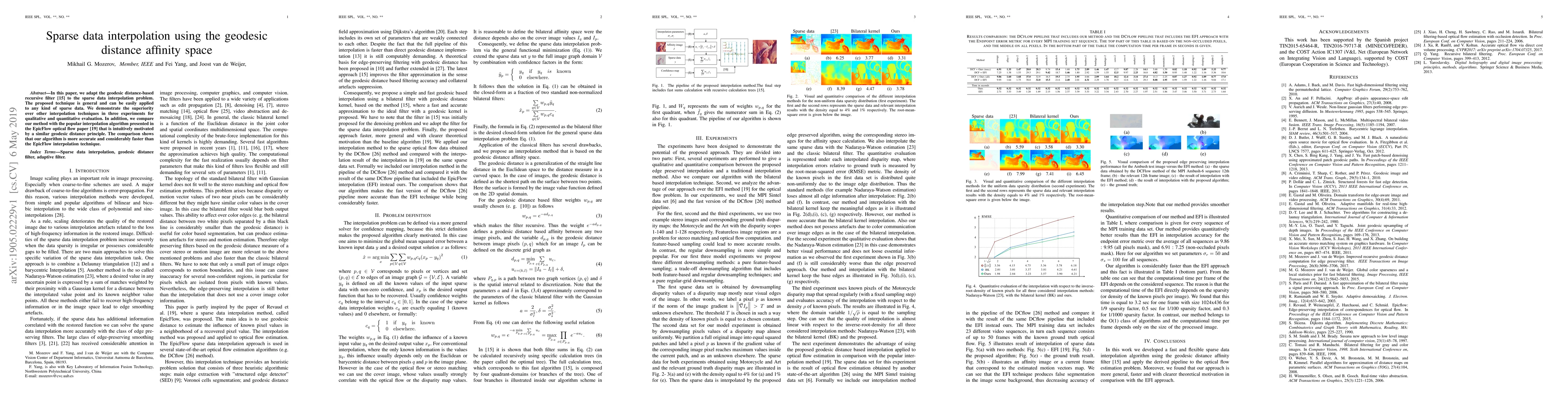 This paper proposes a geodesic distance-based recursive filter for interpolating sparse data, demonstrating superior accuracy and speed compared to the EpicFlow optical flow method. The technique is shown to outperform other interpolation methods in both qualitative and quantitative evaluations.