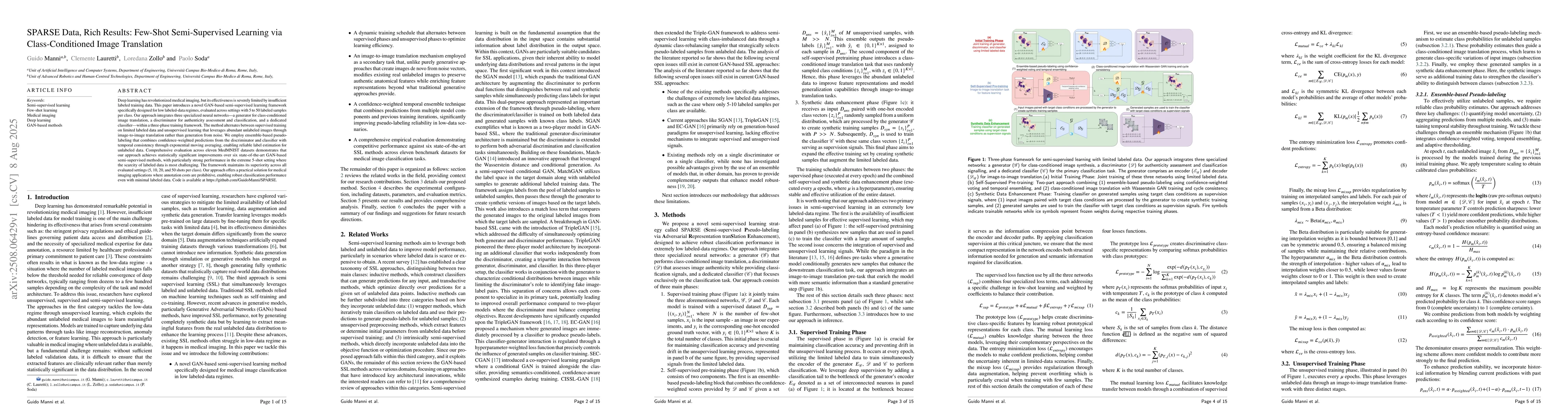 Deep learning has revolutionized medical imaging, but its effectiveness is severely limited by insufficient labeled training data. This paper introduces a novel GAN-based semi-supervised learning framework specifically designed for low labeled-data regimes, evaluated across settings with 5 to 50 labeled samples per class. Our approach integrates three specialized neural networks -- a generator for class-conditioned image translation, a discriminator for authenticity assessment and classification, and a dedicated classifier -- within a three-phase training framework. The method alternates between supervised training on limited labeled data and unsupervised learning that leverages abundant unlabeled images through image-to-image translation rather than generation from noise. We employ ensemble-based pseudo-labeling that combines confidence-weighted predictions from the discriminator and classifier with temporal consistency through exponential moving averaging, enabling reliable label estimation for unlabeled data. Comprehensive evaluation across eleven MedMNIST datasets demonstrates that our approach achieves statistically significant improvements over six state-of-the-art GAN-based semi-supervised methods, with particularly strong performance in the extreme 5-shot setting where the scarcity of labeled data is most challenging. The framework maintains its superiority across all evaluated settings (5, 10, 20, and 50 shots per class). Our approach offers a practical solution for medical imaging applications where annotation costs are prohibitive, enabling robust classification performance even with minimal labeled data. Code is available at https://github.com/GuidoManni/SPARSE.