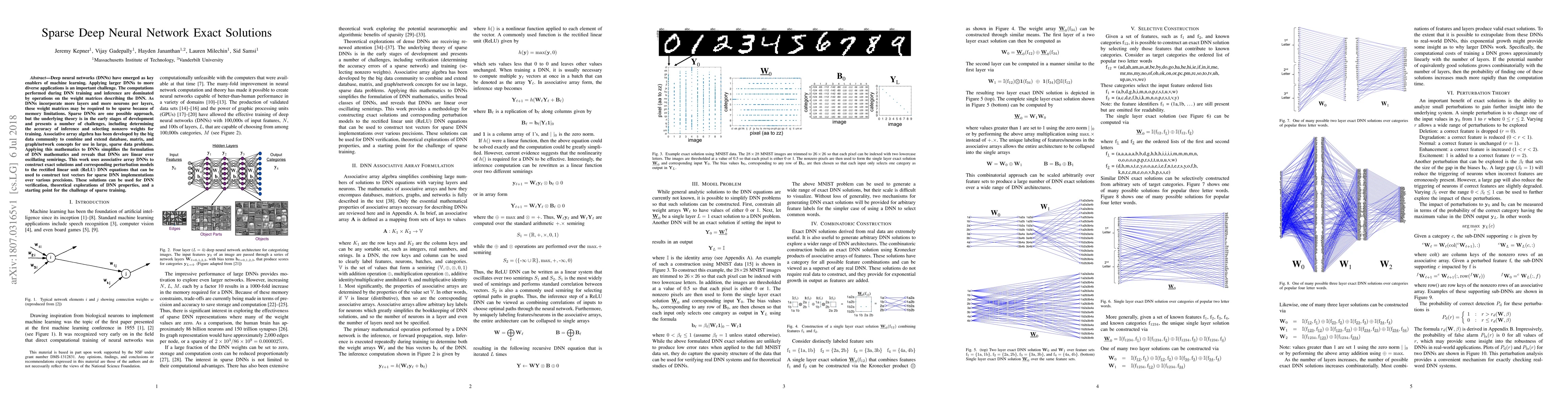 Deep neural networks (DNNs) have emerged as key enablers of machine learning. Applying larger DNNs to more diverse applications is an important challenge. The computations performed during DNN training and inference are dominated by operations on the weight matrices describing the DNN. As DNNs incorporate more layers and more neurons per layers, these weight matrices may be required to be sparse because of memory limitations. Sparse DNNs are one possible approach, but the underlying theory is in the early stages of development and presents a number of challenges, including determining the accuracy of inference and selecting nonzero weights for training. Associative array algebra has been developed by the big data community to combine and extend database, matrix, and graph/network concepts for use in large, sparse data problems. Applying this mathematics to DNNs simplifies the formulation of DNN mathematics and reveals that DNNs are linear over oscillating semirings. This work uses associative array DNNs to construct exact solutions and corresponding perturbation models to the rectified linear unit (ReLU) DNN equations that can be used to construct test vectors for sparse DNN implementations over various precisions. These solutions can be used for DNN verification, theoretical explorations of DNN properties, and a starting point for the challenge of sparse training.