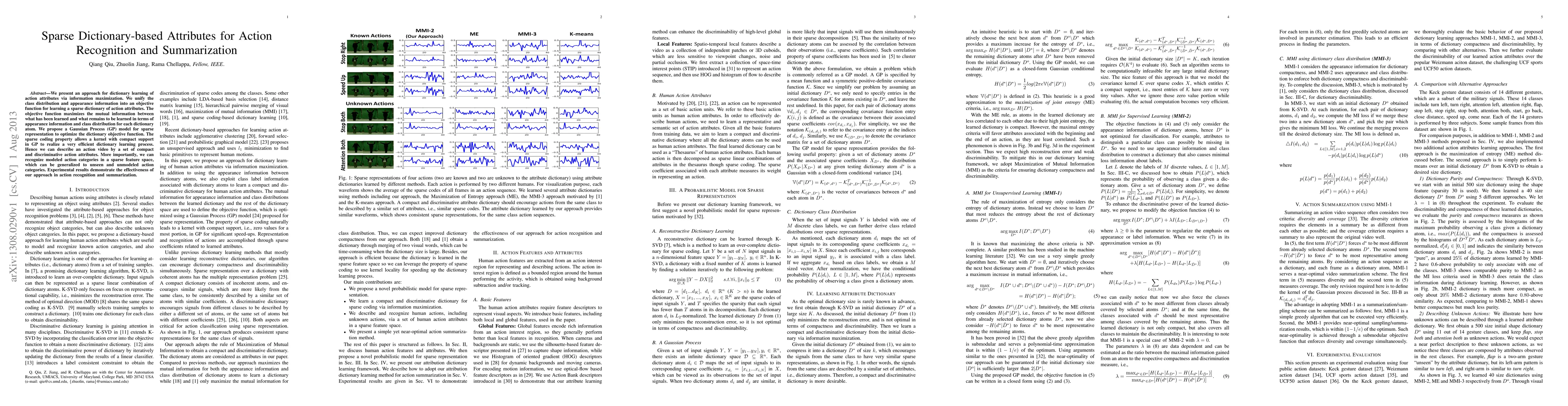 This paper proposes an approach for learning sparse dictionaries of action attributes through information maximization, integrating class distribution and appearance information. The method employs a Gaussian Process model for sparse representation, enabling efficient and discriminative action recognition and summarization, even for unseen action categories.