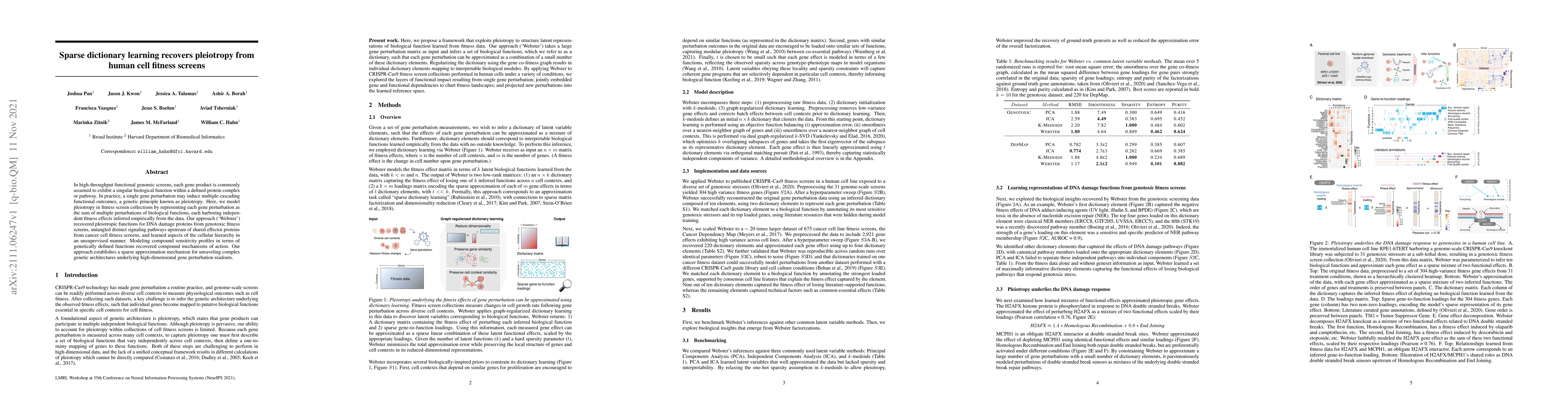 In high-throughput functional genomic screens, each gene product is commonly assumed to exhibit a singular biological function within a defined protein complex or pathway. In practice, a single gene perturbation may induce multiple cascading functional outcomes, a genetic principle known as pleiotropy. Here, we model pleiotropy in fitness screen collections by representing each gene perturbation as the sum of multiple perturbations of biological functions, each harboring independent fitness effects inferred empirically from the data. Our approach ('Webster') recovered pleiotropic functions for DNA damage proteins from genotoxic fitness screens, untangled distinct signaling pathways upstream of shared effector proteins from cancer cell fitness screens, and learned aspects of the cellular hierarchy in an unsupervised manner. Modeling compound sensitivity profiles in terms of genetically defined functions recovered compound mechanisms of action. Our approach establishes a sparse approximation mechanism for unraveling complex genetic architectures underlying high-dimensional gene perturbation readouts.