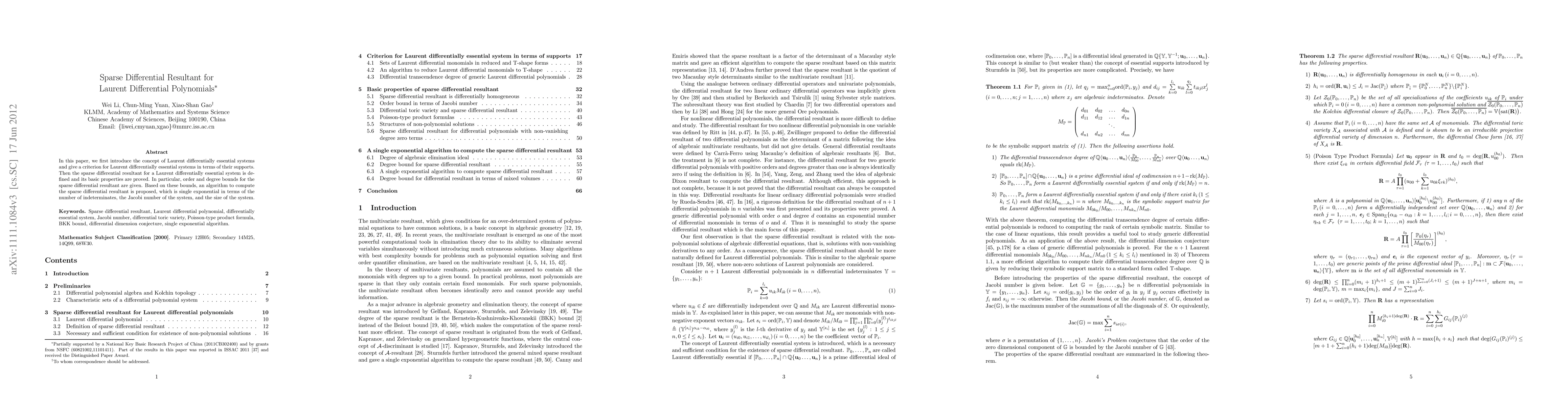 This paper introduces the concept of Laurent differentially essential systems and defines a sparse differential resultant for these systems, proving its properties and providing an algorithm for its computation that runs in single exponential time relative to system parameters. The resultant's order and degree bounds are also established.