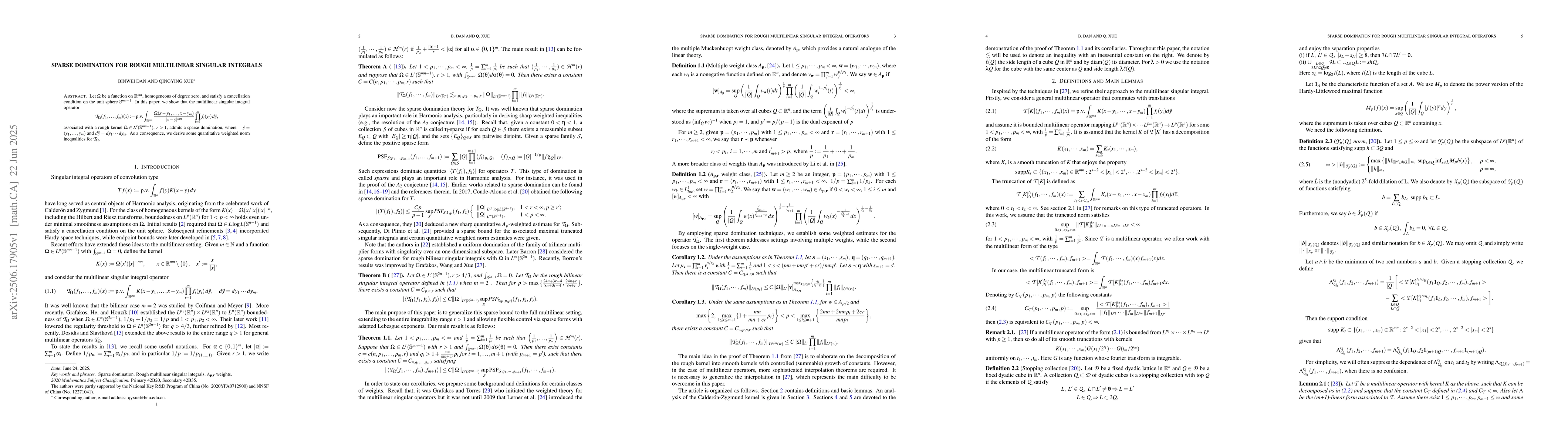 Let $\Omega$ be a function on $\mathbb{R}^{mn} $, homogeneous of degree zero, and satisfy a cancellation condition on the unit sphere $\mathbb{S}^{mn-1}$. In this paper, we show that the multilinear singular integral operator \[ \mathcal{T}_{\Omega}(f_1, \ldots, f_m)(x) := \mathrm{p.v.} \int_{\mathbb{R}^{mn}} \frac{\Omega(x - y_1, \ldots, x - y_m)}{|x - \vec{y}|^{mn}} \prod_{i=1}^m f_i(y_i) \, d\vec{y}, \] associated with a rough kernel $\Omega \in L^r(\mathbb{S}^{mn-1}) $, $r > 1 $, admits a sparse domination, where $\quad \vec{y}=(y_1,\ldots,y_m)$ and $ d\vec{y}=dy_1\cdots dy_m$. As a consequence, we derive some {quantitative weighted norm inequalities} for $ \mathcal{T}_{\Omega} $.
