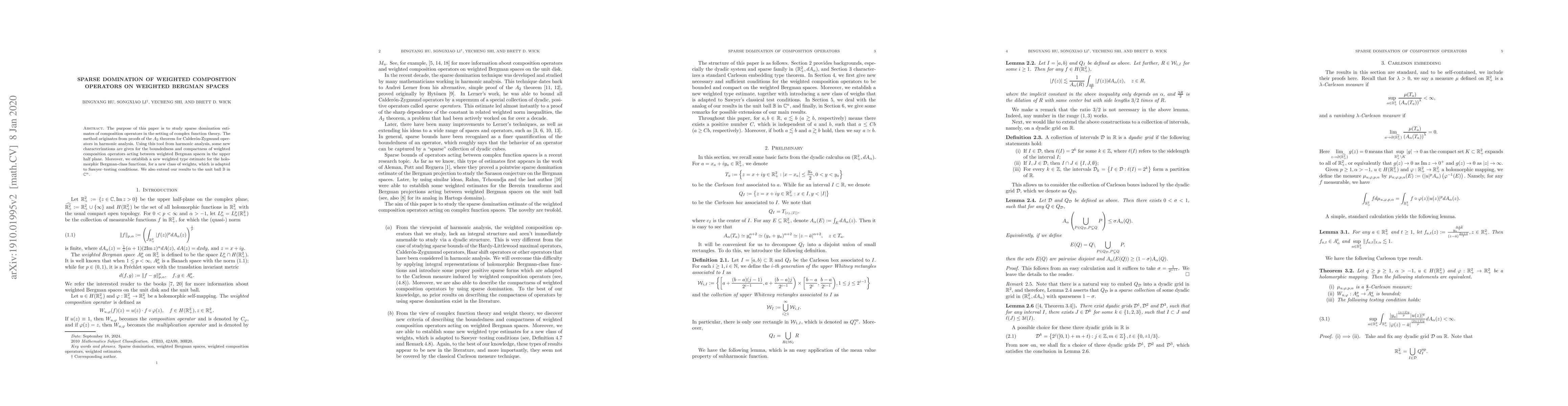 The purpose of this paper is to study sparse domination estimates of composition operators in the setting of complex function theory. The method originates from proofs of the $A_2$ theorem for Calder\'on-Zygmund operators in harmonic analysis. Using this tool from harmonic analysis, some new characterizations are given for the boundedness and compactness of weighted composition operators acting between weighted Bergman spaces in the upper half plane. Moreover, we establish a new weighted type estimate for the holomorphic Bergman-class functions, for a new class of weights, which is adapted to Sawyer--testing conditions. We also extend our results to the unit ball $\mathbb B$ in $\mathbb C^n$.