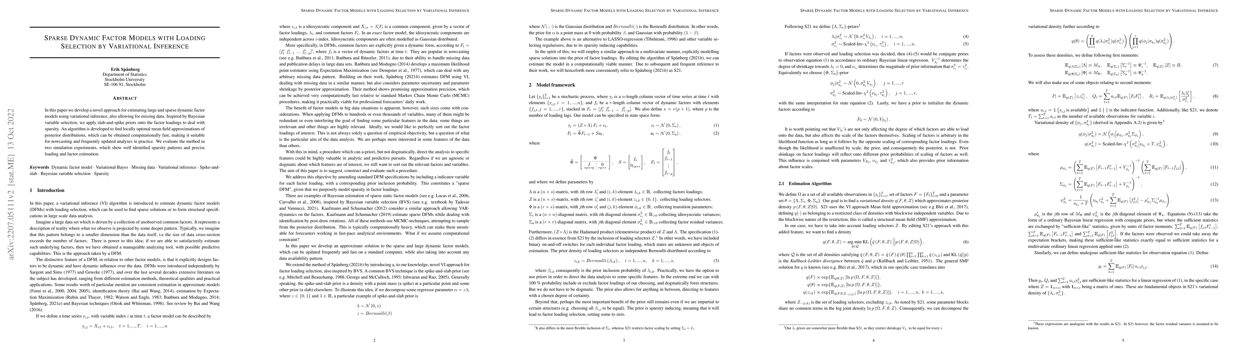 This paper introduces a novel sparse dynamic factor model with variational inference for estimating large datasets, incorporating slab-and-spike priors for loading selection to handle sparsity. The method is computationally efficient, suitable for real-time analyses, and demonstrated through simulations to accurately identify sparsity and estimate loadings and factors.