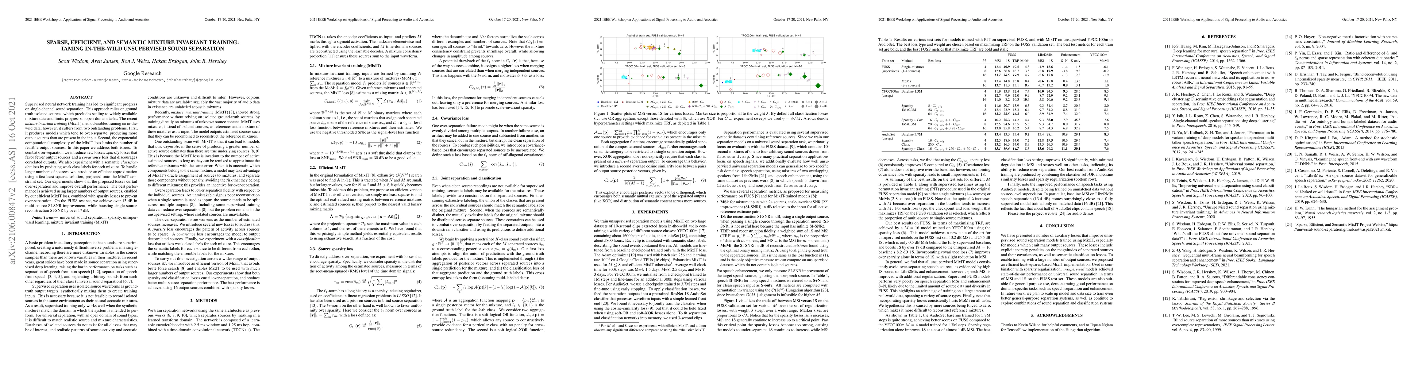 This paper proposes new losses and an efficient approximation to MixIT for unsupervised sound separation, addressing over-separation and computational complexity. It introduces sparsity and covariance losses to reduce output sources and an efficient MixIT loss for scalability, achieving significant improvements in separation performance.