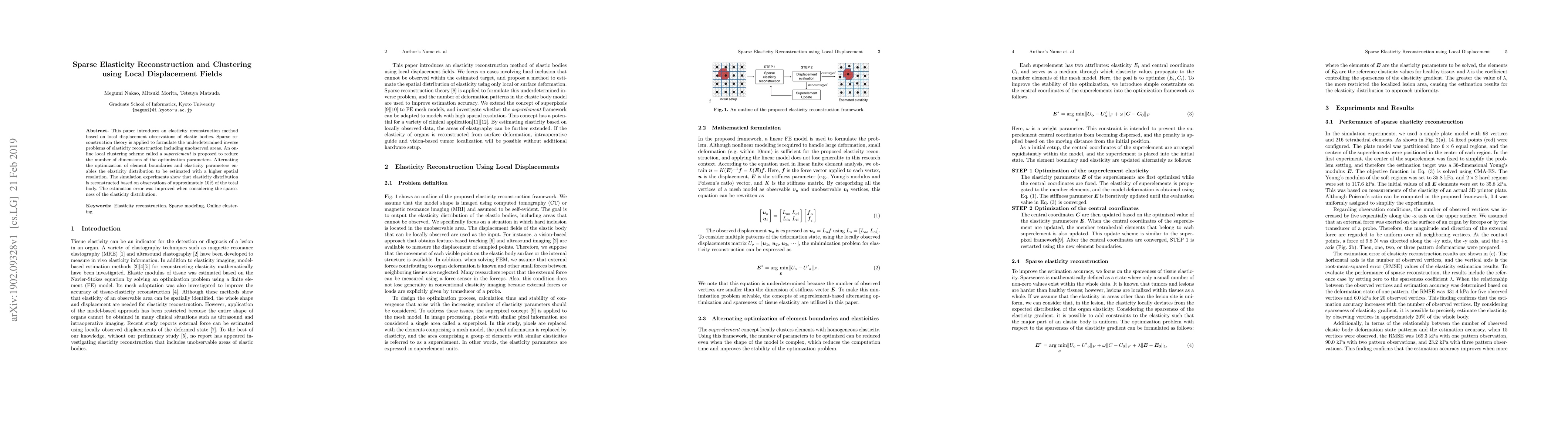 This paper presents a sparse elasticity reconstruction method using local displacement fields, applying sparse reconstruction theory to address underdetermined inverse problems. An online local clustering scheme reduces optimization parameters, enhancing spatial resolution and improving estimation error with observations from just 10% of the body.