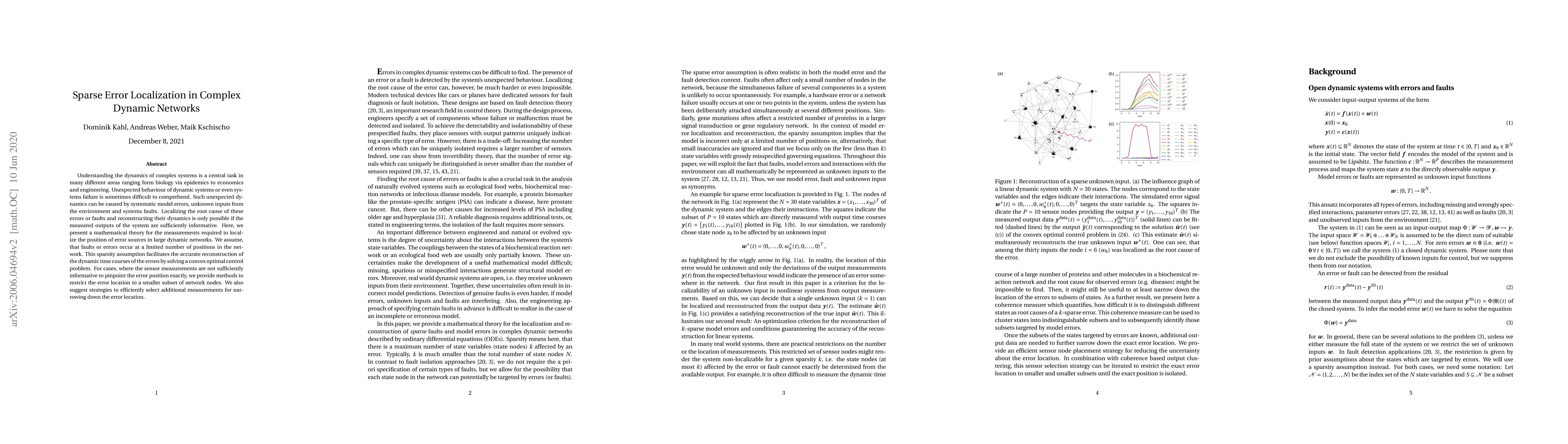 Understanding the dynamics of complex systems is a central task in many different areas ranging form biology via epidemics to economics and engineering. Unexpected behaviour of dynamic systems or even systems failure is sometimes difficult to comprehend. Such unexpected dynamics can be caused by systematic model errors, unknown inputs from the environment and systems faults. Localizing the root cause of these errors or faults and reconstructing their dynamics is only possible if the measured outputs of the system are sufficiently informative. Here, we present a mathematical theory for the measurements required to localize the position of error sources in large dynamic networks. We assume, that faults or errors occur at a limited number of positions in the network. This sparsity assumption facilitates the accurate reconstruction of the dynamic timecourses of the errors by solving a convex optimal control problem. For cases, where the sensor measurements are not sufficiently informative to pinpoint the error position exactly, we provide methods to restrict the error location to a smaller subset of network nodes. We also suggest strategies to efficiently select additional measurements for narrowing down the error location.