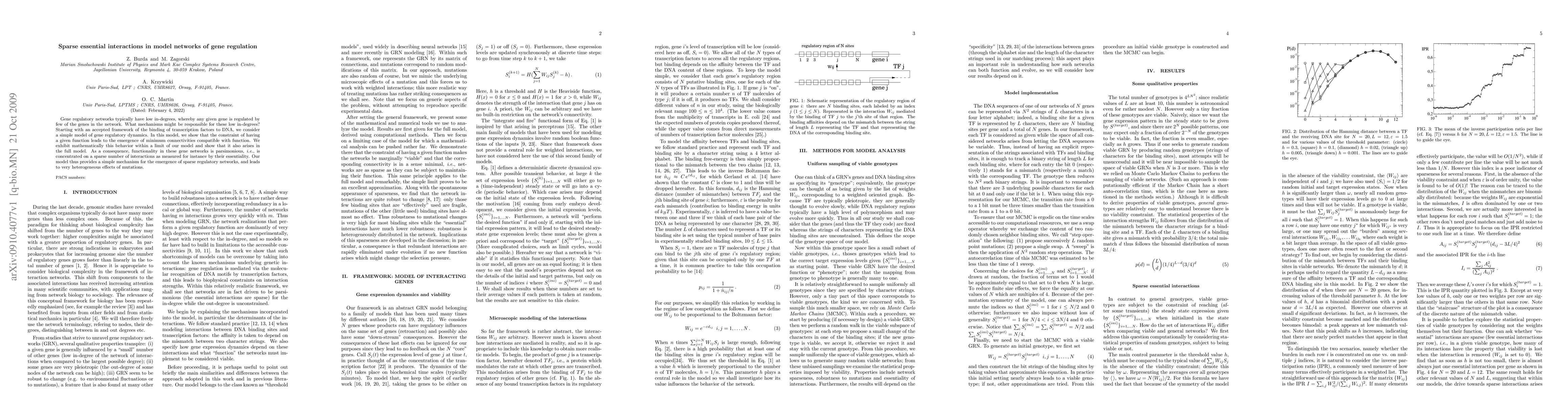 This paper proposes a simple model for gene regulatory networks, demonstrating that the functional constraints lead to sparse essential interactions, explaining the low in-degrees typically observed in these networks. The model shows that functionality is concentrated on a few critical interactions, providing a mechanism for the emergence of sparse regulatory networks.